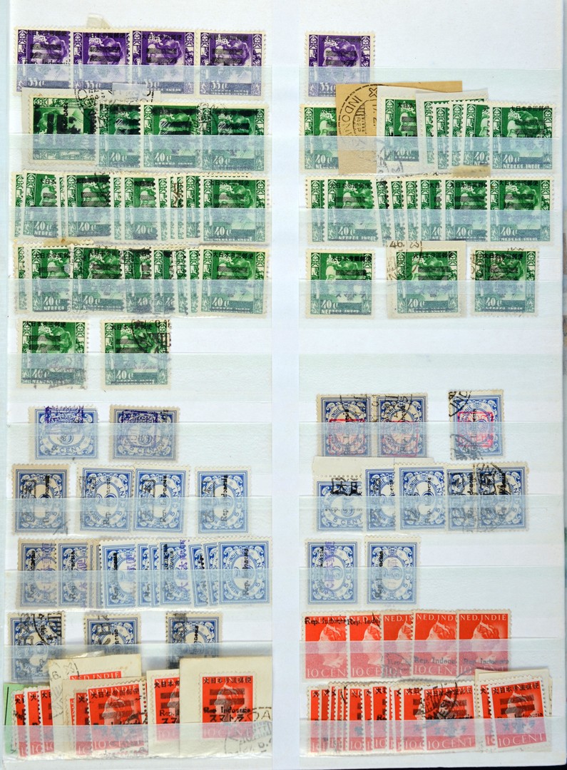 REPUBLIK INDONESIA 1945-1949, JAVA & SUMATRA. Stock book filled with thousands of unused and used stamps (some nice pmks) showing a very great variety of hand stamp and machine overprints, stamps with pencil lines and brush strokes, Provisional issues, General issues with and without overprints, many of these in larger quantities, all together a most interesting stock and treasure trove, rarely offered in this quantity and variety