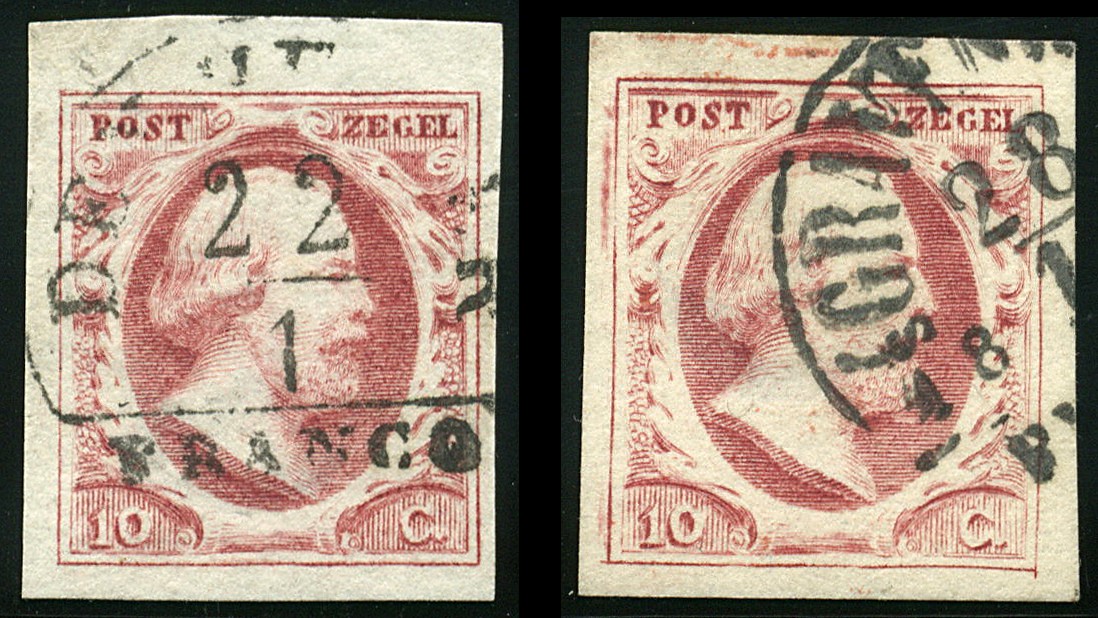 2a/b, 10 Cent plaat I in diverse tinten karmijn w.o. diepdonkerkarmijn, 13 losse zegels uit het rechter boven kwadrant van een plaatreconstructie, posities 26, 27, 28, 34, 35, 36, 38, 44, 45, 47, 48, 50 en tevens 20. Prachtexemplaren in uitgezochte kwaliteit w.o. randstuk. € 650++