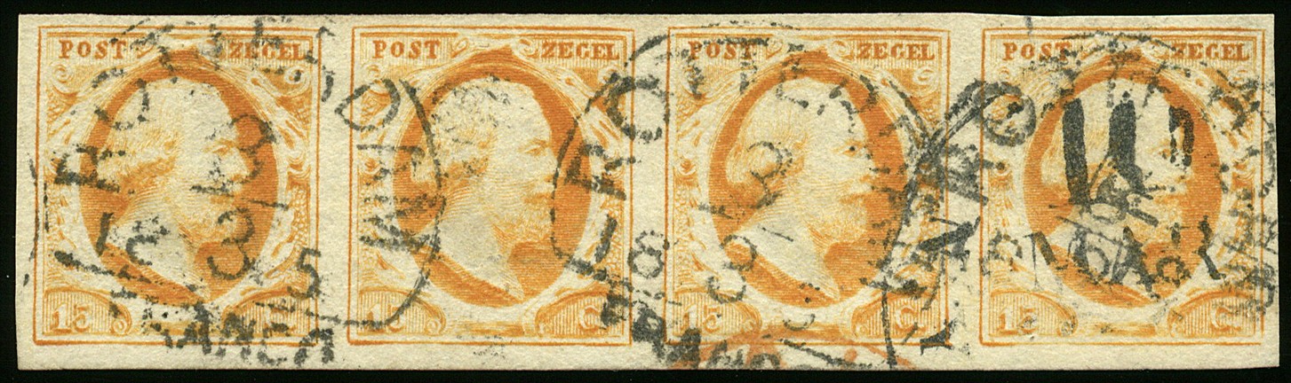 3b, pos. 71/74. Goed tot breed gerande prachtstrip van vier, afgestempeld Rotterdam C groot 3-3-185? met op de rechter zegel een fragment van het Amerikaanse rondstempel ´N.YORK Am.PKt.´