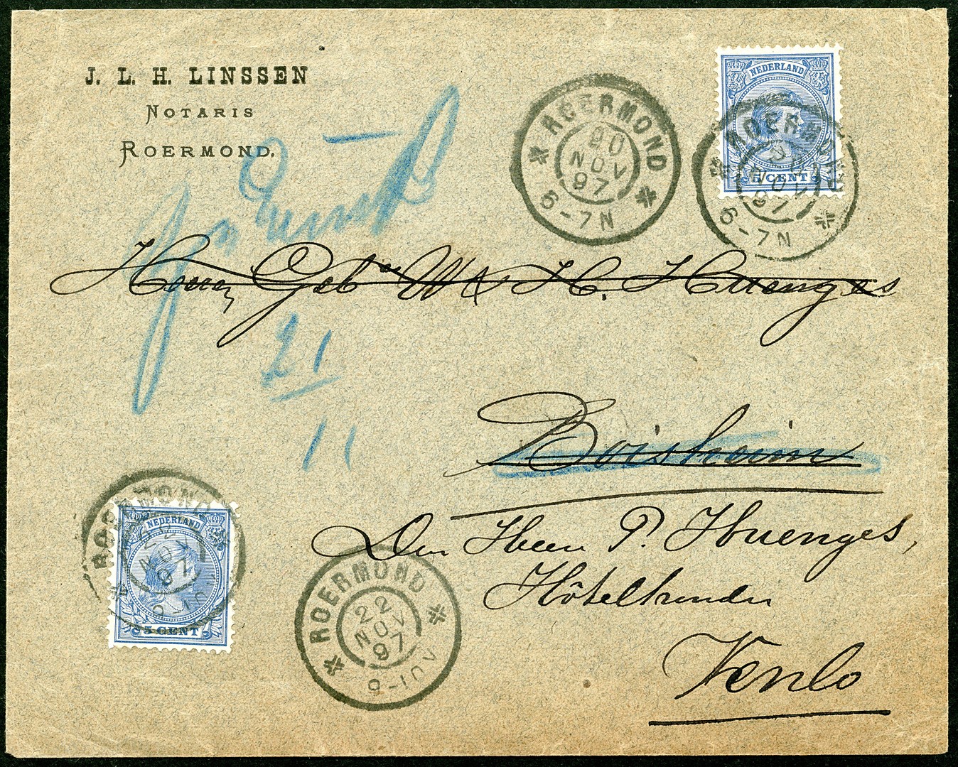 5 Cent Hangend Haar als juiste frankering volgens grenstarief op env. van een notaris te Roermond 20-11-1897 naar Boisheim, geadresseerde niet aanwezig en op 21-11 geretourneerd, nogmaals met 5c gefr. en op 22-11 nu naar Venlo 22-11. Interessant poststuk voor o.a. de Hangend Haar-verzamelaar!