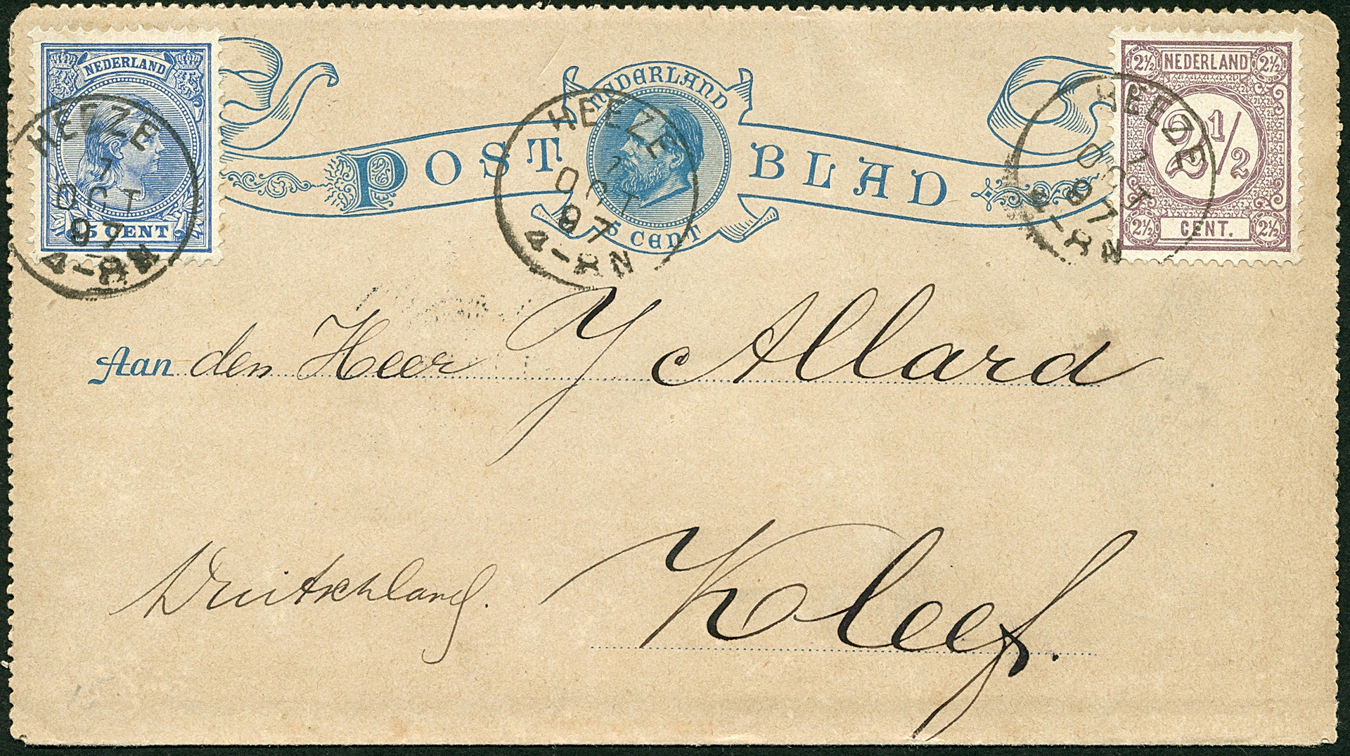 Pb. G1 bijgefr. met 2½c en 5c van Heeze 7-10-1897 naar den Heer Allard te Kleef 8-10