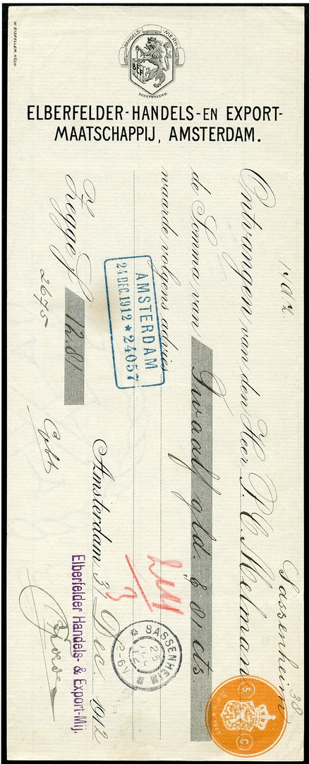 Nachtuur onbekend. Grootrondstempel Sassenheim van 25-12-1912 met nachtuurkarakters 2-6V als aankomststempel op kwitantie met ingedrukt zegel van 5c uit Amsterdam 24-12. Nachtuurkarakters van grootrond Sassenheim nog niet eerder in de literatuur beschreven! In meerdere opzichten een bijzonder stuk!