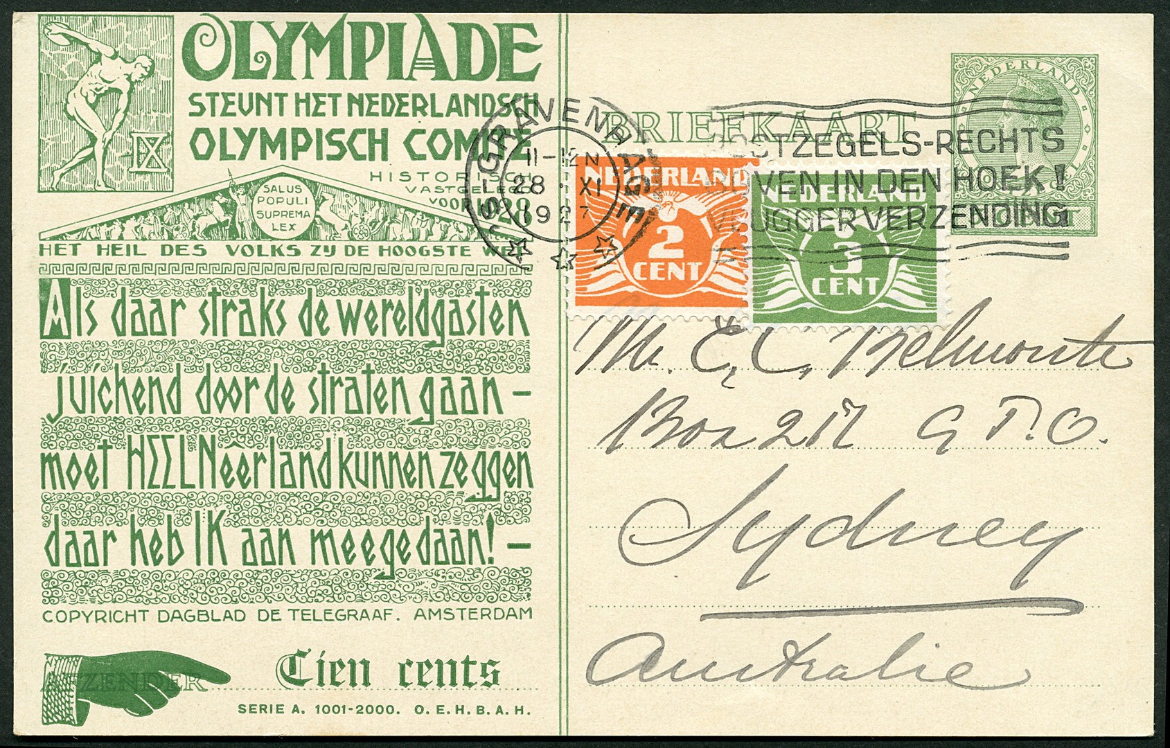 Particulier bedrukte bk. Olympiade 1928, OL10. Prachtkaart bijgefr. met 2c en 3c van 's-Gravenhage 28-11-1927 naar Sydney (az. onbeschreven)