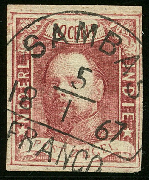 Halfrond-franco SAMBAS op 10c nr. 1. Prachtige zegel met bijzonder mooie kleur met superbe afst. Ons zijn slechts enkele ex. bekend. Een plaatje! Superb in every way and only a few copies recorded. An eye-catcher!
