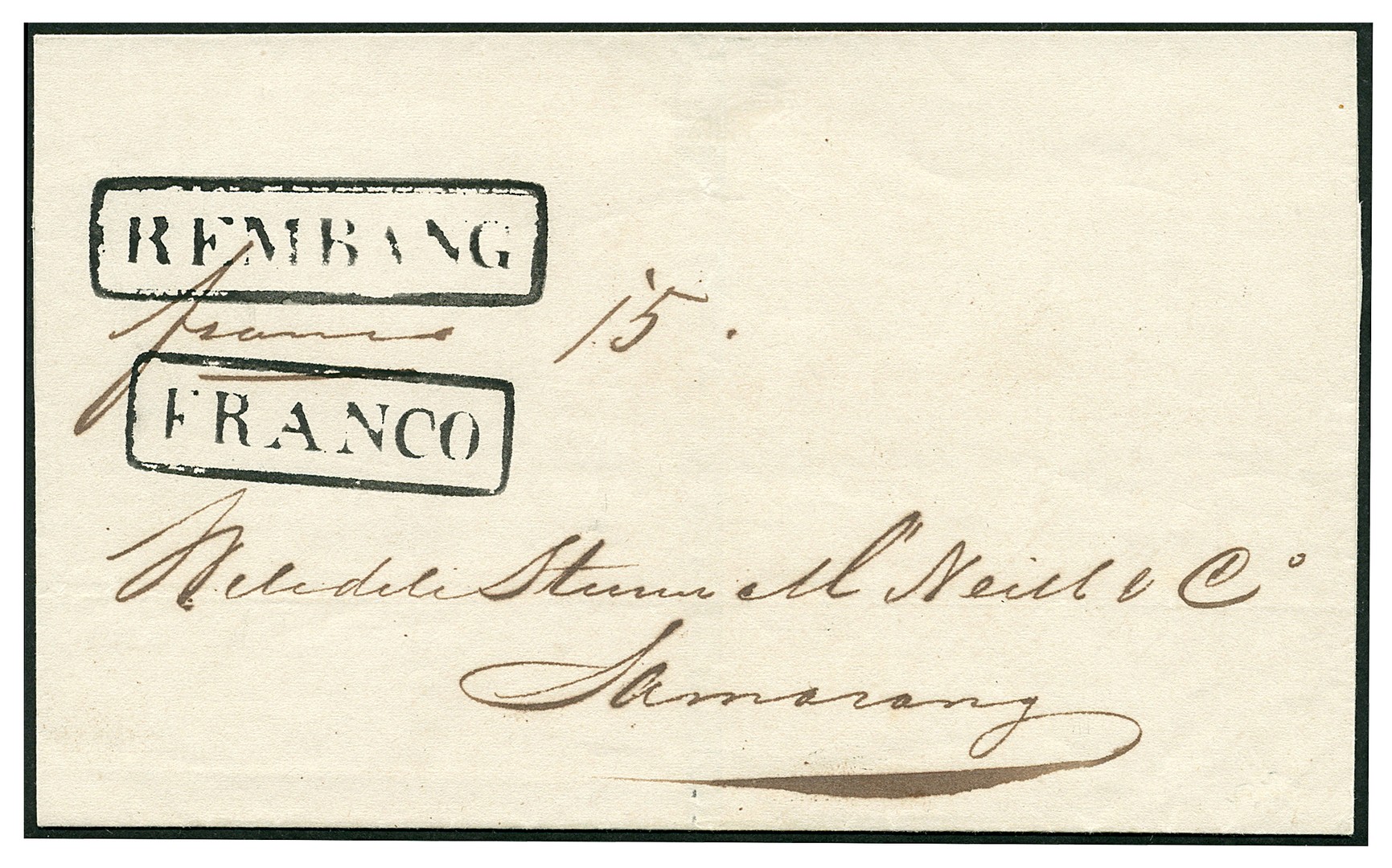 REMBANG. Naamstempel 'Rembang' waaronder 'Franco' op zeer frisse, ongedateerde briefomslag met potloodnotitie 1851 naar Samarang, met geschreven betaald port '15' duiten. Luxe afst.