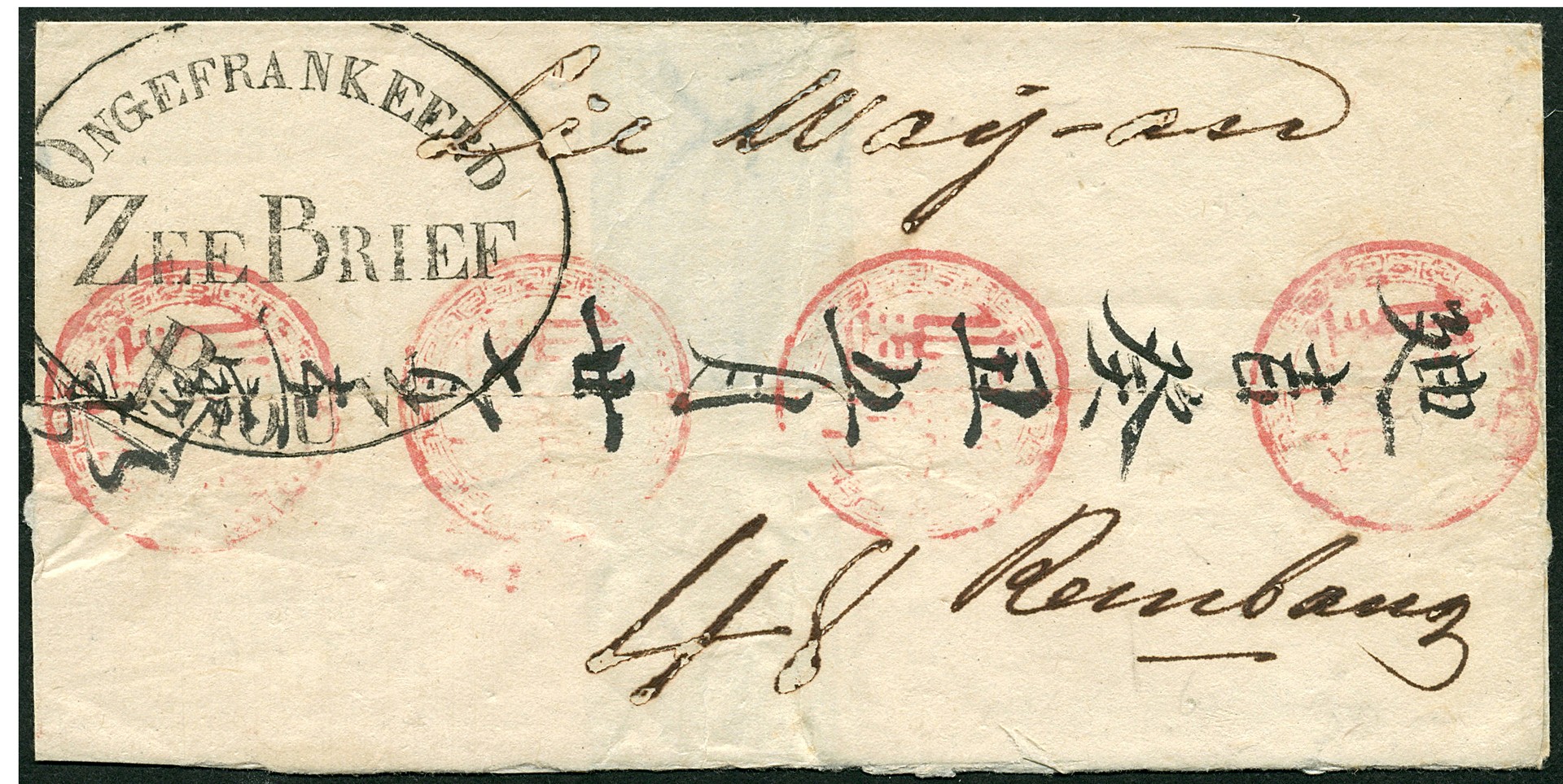 RIOUW. Superbe afdruk ovaalstempel ´Ongefrankeerd/ZeeBrief/Riouw´ (WdB.260a) op Chinezenbrief van ca. 1860 naar Rembang met op vz. geschreven port ´48´