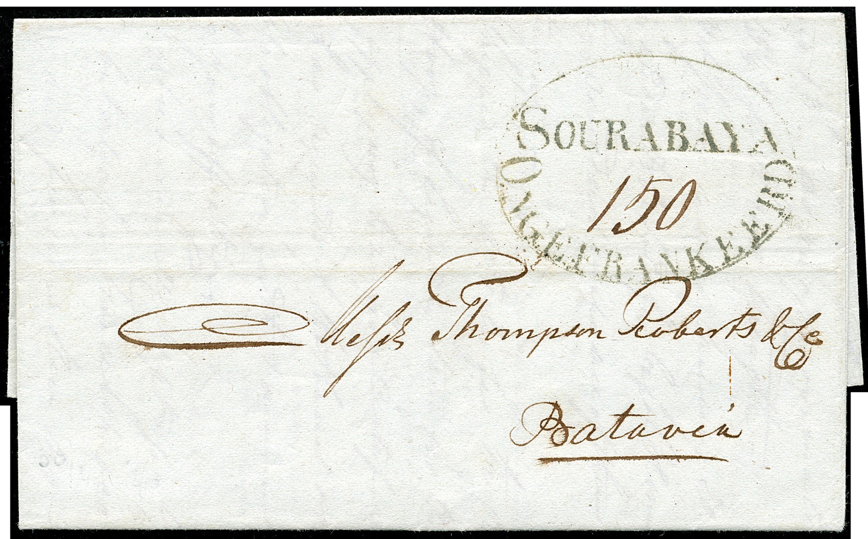 SOURABAYA. Ovaalstempel 'Sourabaya/Franco' in rood (WdB.292c) op frisse brief (min. scheurtje gerep.) van 6-8-1834 naar Passaroeang met geschreven betaald port '20' centen koper, alsmede ovaalstempel 'Sourabaya/Ongefrankeerd' in groen (WdB.291d) op frisse brief van 30-4-1840 naar Batavia met geschreven port '150' centen koper. Prachtafst.