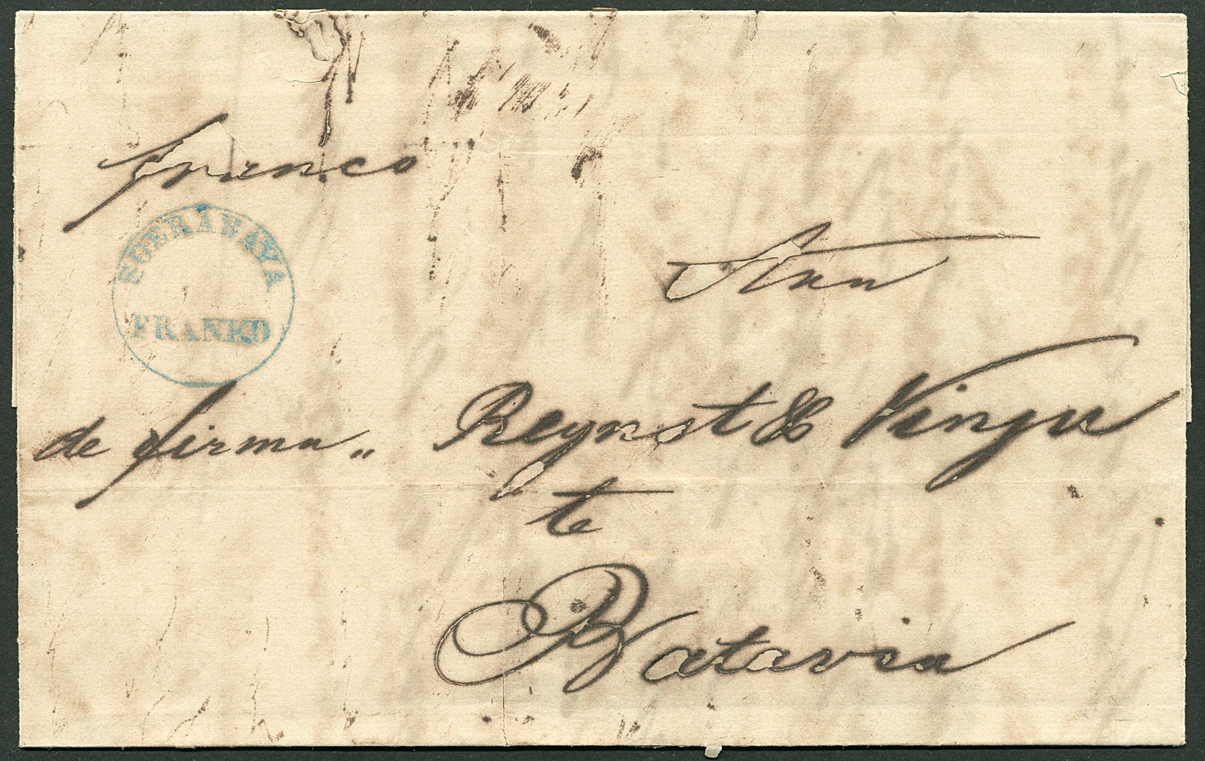 SOERABAYA. Rondstempel 'Soerabaya/Franko' in blauw (WdB.349b) op brief (iets inktvraat) van 11-6-1855 naar Batavia met op az. geschreven betaald port '95' duiten, alsmede rondstempel 'Soerabaya/Franco.' in blauw (WdB.350b) op brief (Armeens?) van 23-?-1862 naar Batavia met op az. geschreven betaald port '76' centen zilver