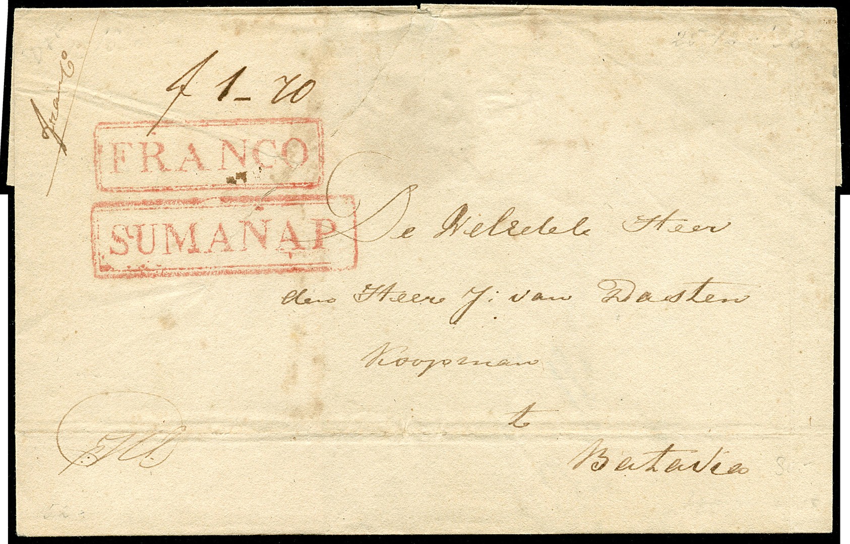SUMANAP. Naamstempel 'Sumanap' waarboven 'Franco' in rood (WdB.303c) op gedateerde, iets gerep. briefomslag van Sumanap (= Soemenep, Madoera) 25-12-1839 naar een koopman te Batavia, met geschreven betaald port ''f.1-70' = 170 centen koper