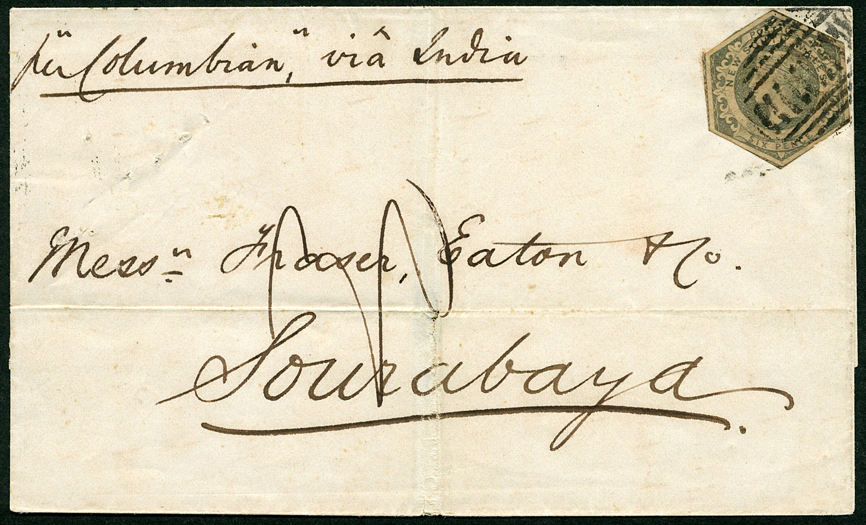 AUSTRALIË. NEW SOUTH WALES. Briefomslag (hor. en vert. vouw) met uit 6d. SG.91 geknipte zegel van Sydney 17-7-1857 per ´Columbian´ via India naar Soerabaja. Zeer zeldzame herkomst!