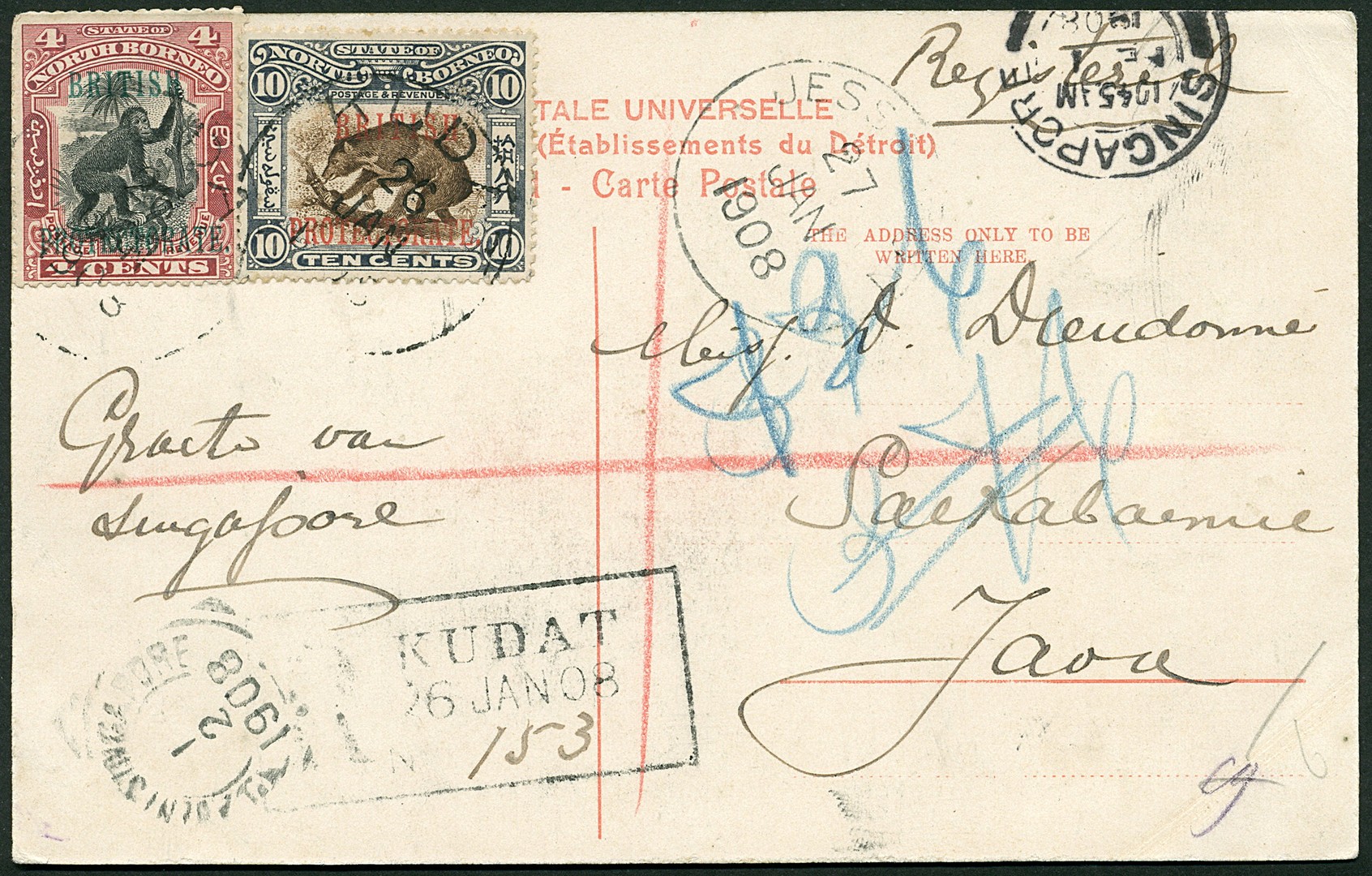 BRITS NOORD-BORNEO. Prentbk. gefr. met 4c en 10c van Kudat 26-1-1908 aangetekend via Jesselton 27-1, Singapore 1-2 en de N.I.Agent Singapore 1-2 naar Soekaboemi