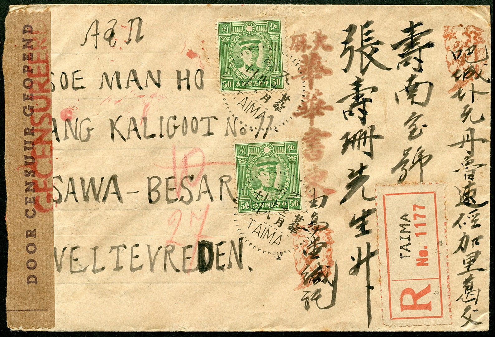 CHINA. Env. gefr. met 2x 50c van Taima aangetekend naar Bataviacentrum 2-1-1941 en daar gecensureerd. Zeldzame herkomst! Tevens twee brieven uit 1940-41 naar Pasoeroean