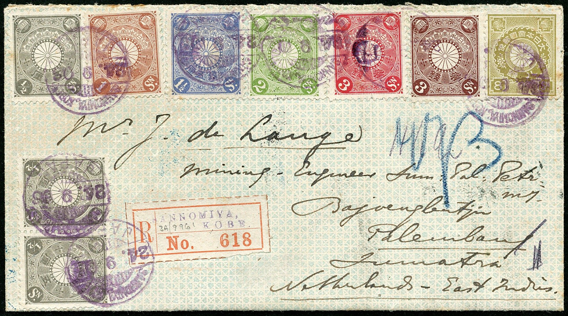 JAPAN. Postblad met binnenin een prachtig geschilderde afbeelding van een verleidelijke geisha, weelderig gefr. tezamen 20s, aangetekend van Sannomiya Kobe 24-9-1906 via Singapore, de N.I.Agent Singapore over Palembang naar een mijningenieur te Bajoenglentjir 24-10. Tevens env. van Yokohama naar Singapore en op 15-3-1916 via de N.I.Postagent/Singapore doorgez. naar Medan 17-3