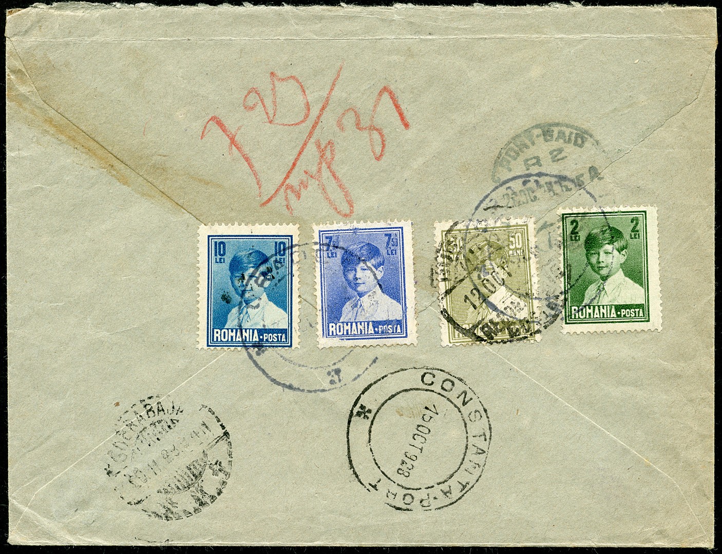 ROEMENIË. Bk. van Ploesti 7-6-1907 naar Soerabaja 8-7, alsmede env. op az. gefr. aangetekend van Oradea 11-10-1928 naar Soerabaja 29-11. Tevens bk. (vouw) uit Sofia (Bulgarije) 10-2-1910 naar Soerabaja