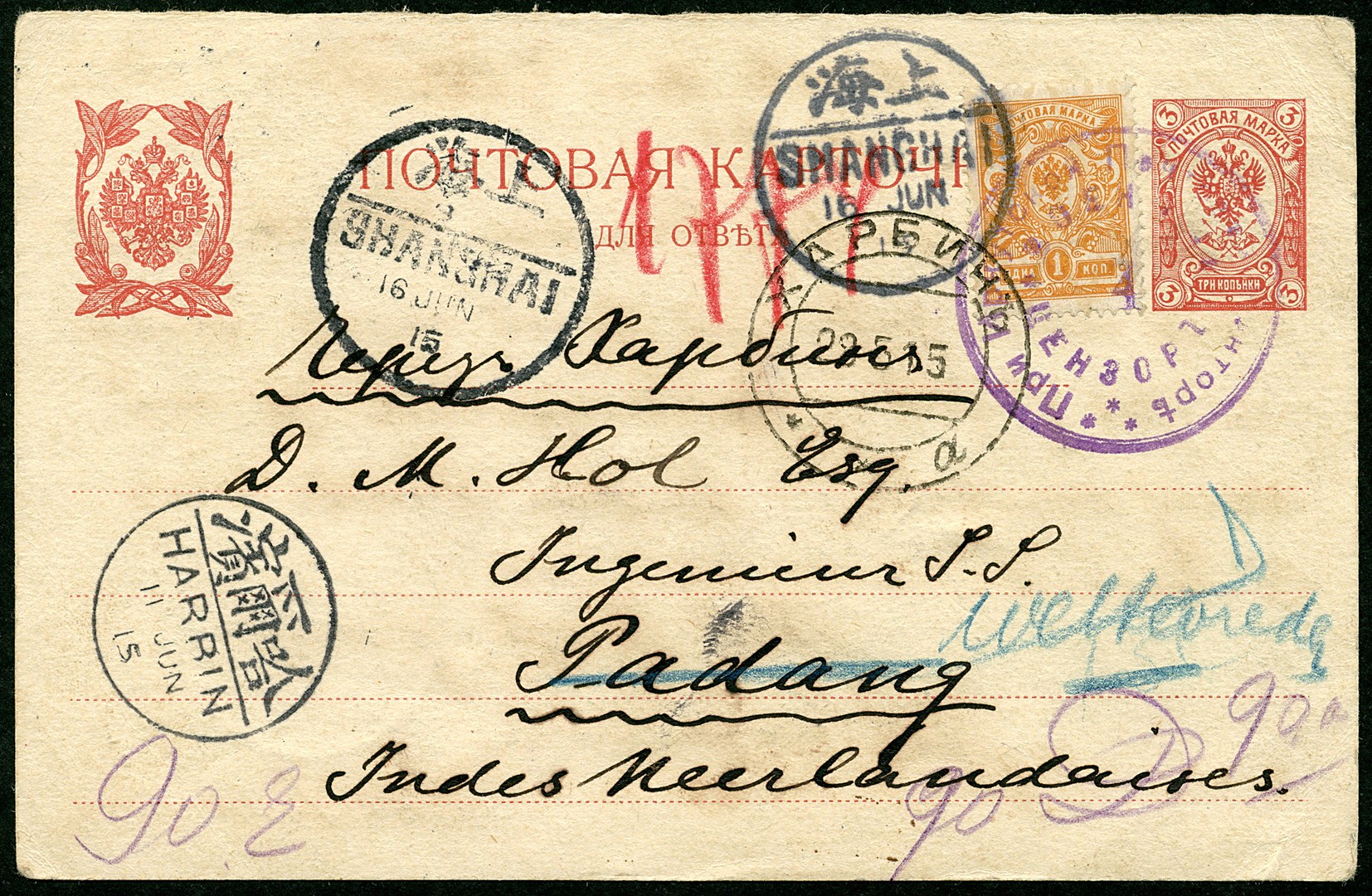 RUSLAND. Bk. van 3k bijgefr. met 1k van Kirinsk (Siberië) 7/20-5-1915 over Harbin 11-6 en Shanghai 16-6 naar Padang, doorgez. naar Weltevreden. Bijzondere route! Info bijgesloten