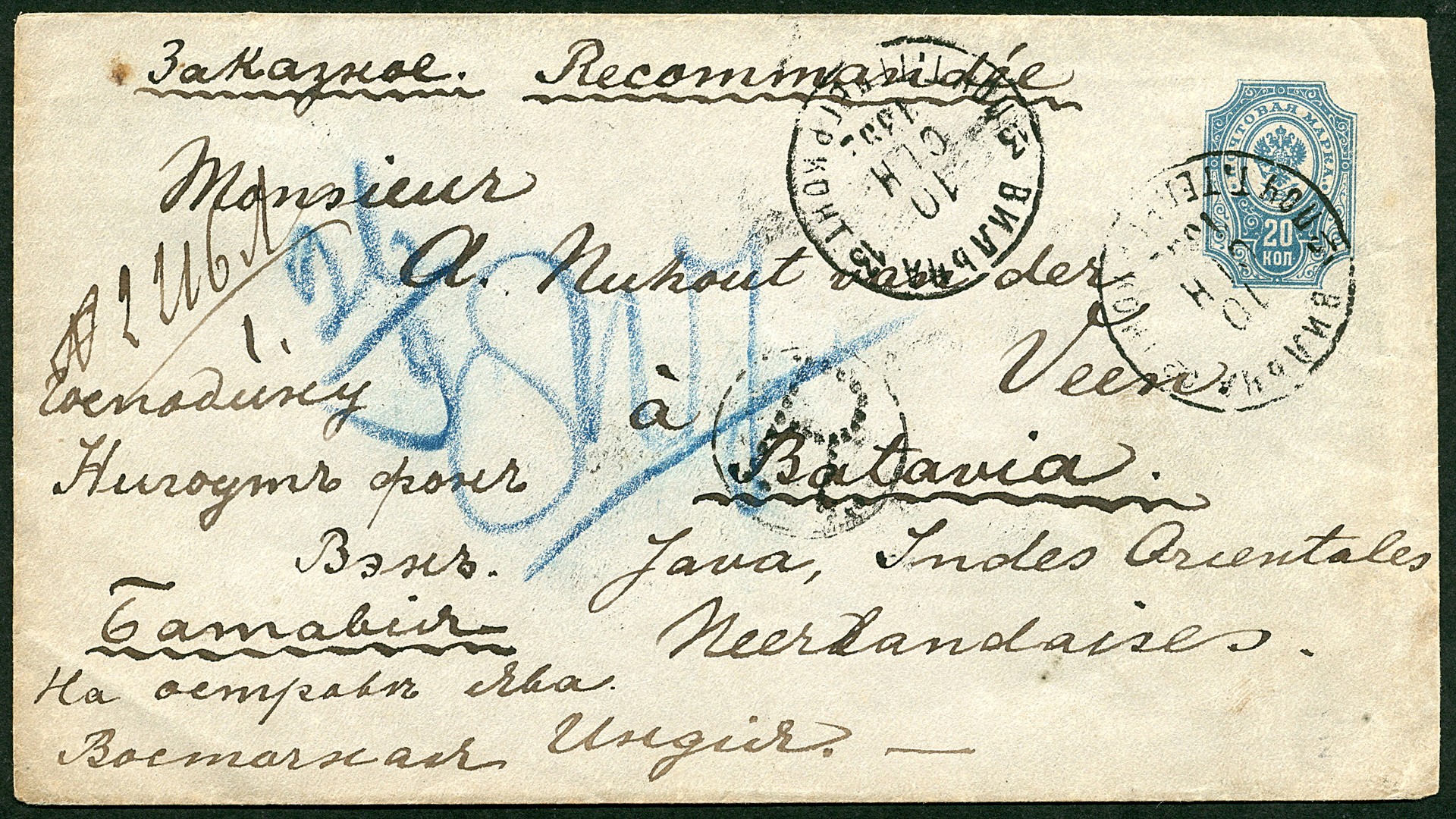 RUSLAND. LITOUWEN. Env. van 20k van Wilna (Vilna = Vilnius) 10-9-1892 aangetekend naar Batavia. Zeldzame herkomst!