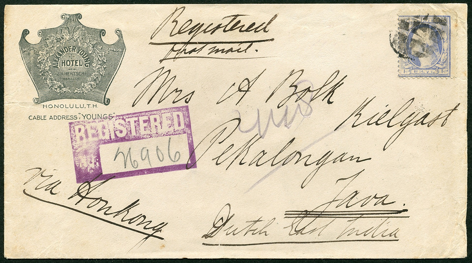 USA. HAWAII. Env. van het Alexander Young Hotel in Honolulu op 6-6-1911 aangetekend over Hong Kong 3-7 naar Pekalongan 15-7