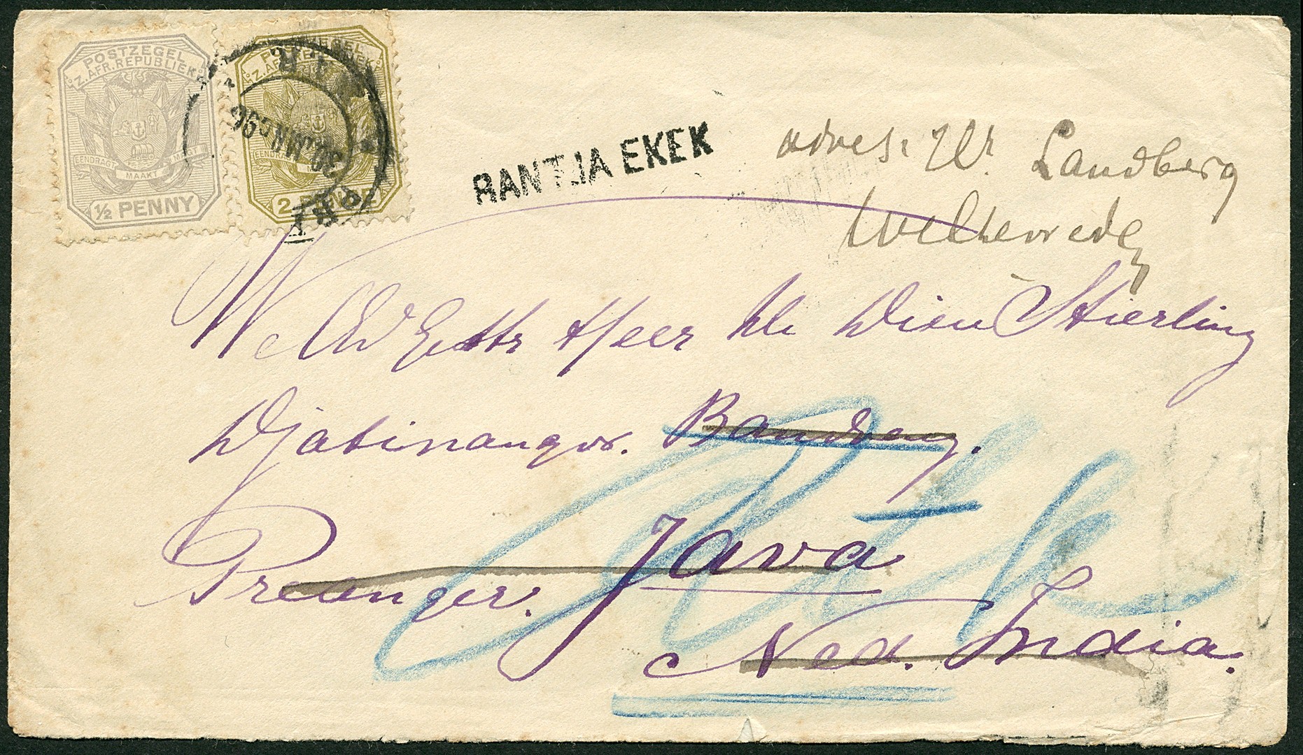 ZUID-AFRIKA. Zuid-Afrikaanse Republiek. Bk. van 1d uit Pretoria 20-6-1896 naar Banda, env. gefr. met ½d en 2d van Pretoria 30-1-1896 doorgez. naar Rantja Ekek (naamstempel) en env. gefr. met ½d en 1d in paar van Middelburg 30-12-1899 naar Wlingi. Tevens R-env. van 6d bijgefr. met 1d uit de Unie van Zuid-Afrika van Thabancho 17-11-1923 naar Soerabaja