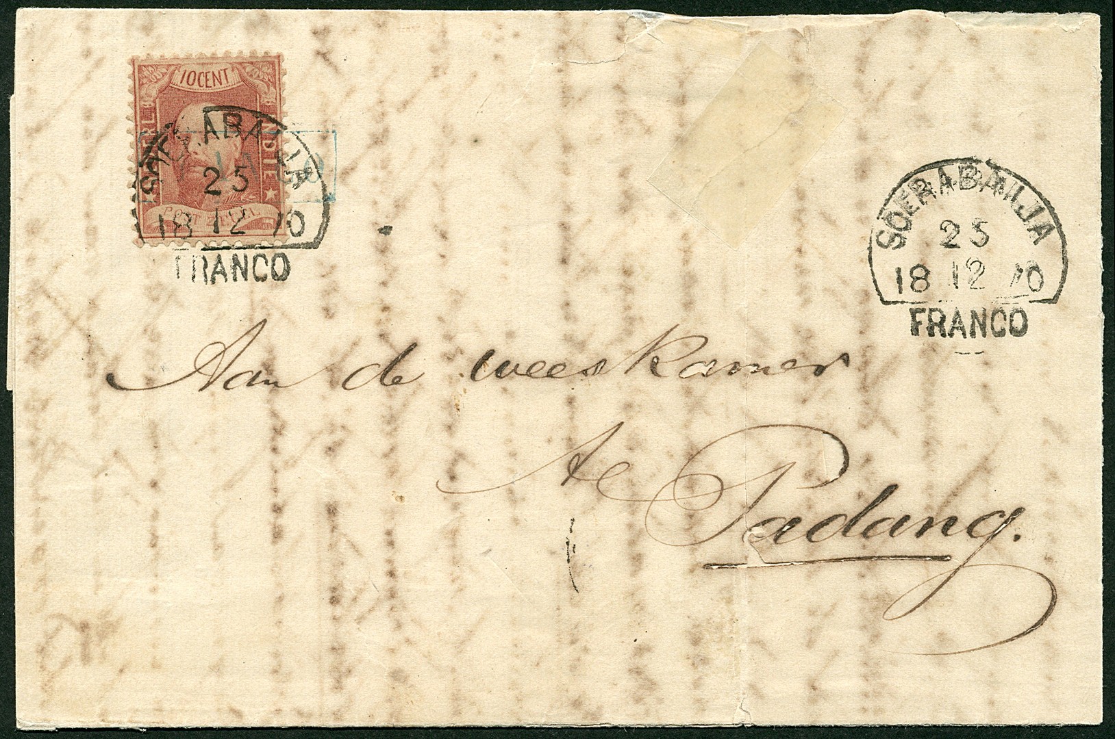 SOERABAIJA. 10 Cent nr. 2 (prachtzegel!) op wat gerepareerde briefomslag van Bangkalang (az. lichte afdruk naamstempel in rood) over Soerabaija eerste kerstdag 1870 naar de weeskamer te Padang (op az. fragment as.). De zegel is eerst heel licht afgestempeld met Franco in kader in blauw (!), waarschijnlijk op het hulppostkantoor van Bangkalang te Madoera. De zegel is van pracht kwaliteit, de briefomslag toont wat ouderdomskwaaltjes, doch het geheel is zeer bijzonder!