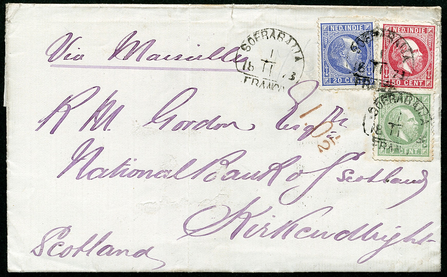 SOERABAIJA. 5 Cent nr. 8A, 20c nr. 12A en 50c nr. 15A op complete vouwbrief (verticale archiefvouw, ook door zegels van 5c en 50c, doch niet echt goed zichtbaar) van Soerabaija 1-11-1871 via Marseille naar ´My dearest Uncle Robert´ te Kirkcudbright in Schotland 1-12, met op vz. Brits portstempel ´1.0½´. Ondanks de kwaliteitsbemerking een prachtige tricolore om dit zeldzame tarief te maken (zie ook veiling 635, kavel 1992)