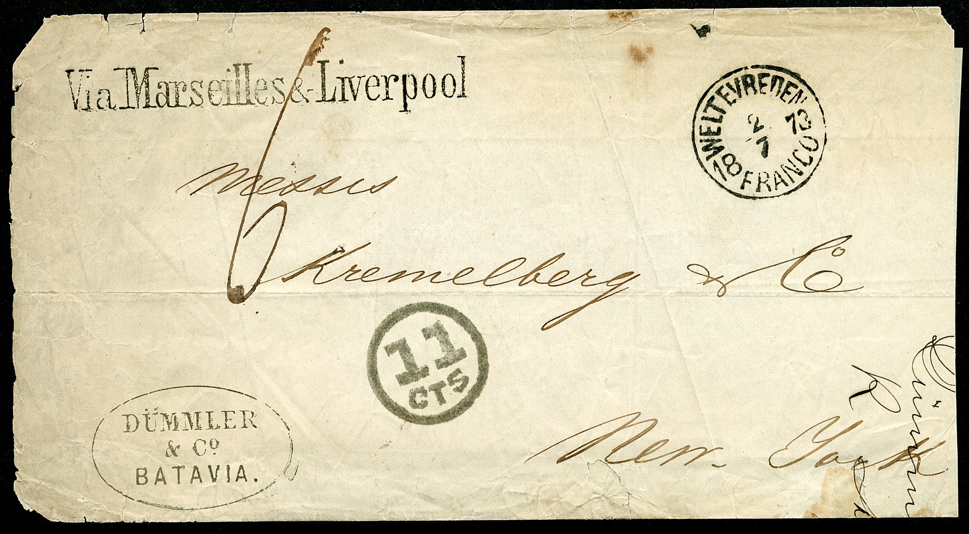 WELTEVREDEN. Ongefrankeerde drukwerkomslag van Weltevreden 2-7-1873 ´Via Marseilles & Liverpool´ (niet postaal maar van afzender) naar New York (25-8?) met geschreven port ´6´ en Amerikaans portstempel ´11cts´ in cirkel. Een superbe afdruk van dit prachtige rond-francostempel!