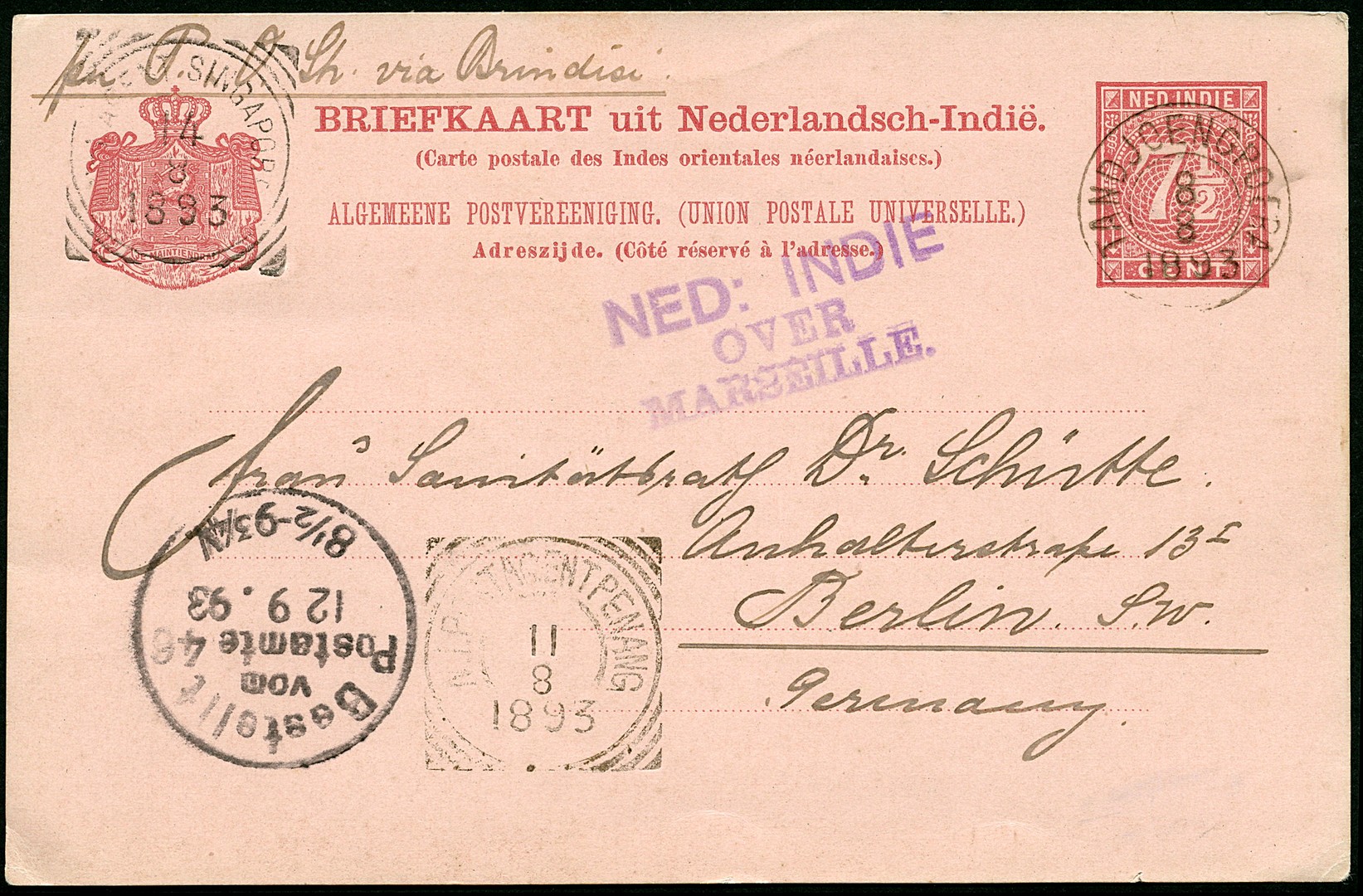 Bk. G12 afgest. met kleinrond TANDJOENGPOERA 8-8-1893 via beide postagentschappen naar Berlijn 12-9, een zeer laat gebruik van het kleinrondstempel! Tevens bk. G9 (mist hoekje) met luxe afdruk vierkant TANDJONGPOERA (type I) 19-1-1894 naar Berlijn 18-2