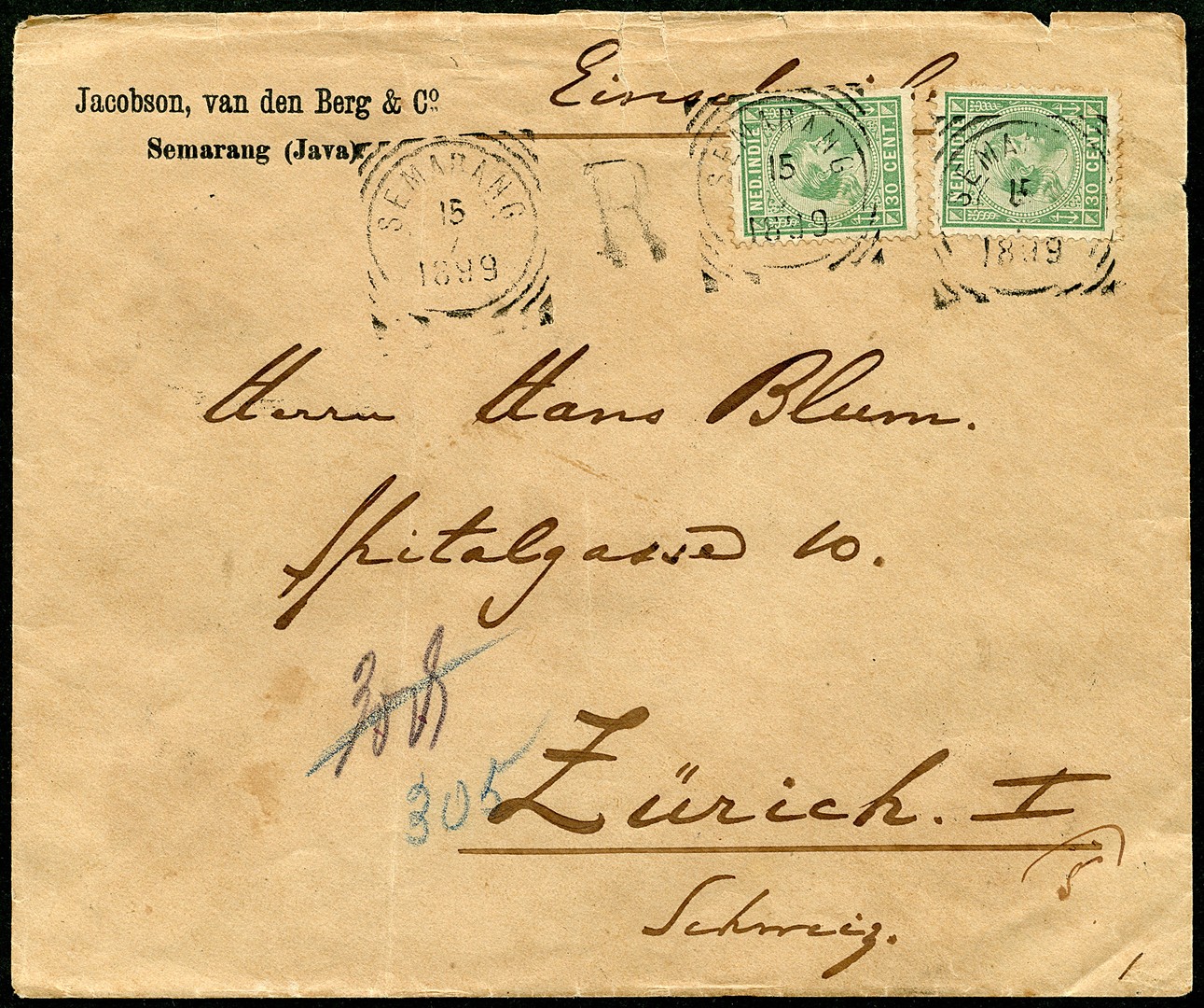 30 Cent nr. 28 2x op firmacouvert van de 2e gew. klasse van Semarang 15-7-1899 aangetekend over Weltevreden 17-7 naar Zürich 17-8. Briefport 2e gew. kl. 50c + R-recht 10c. Zeldzame frankering!