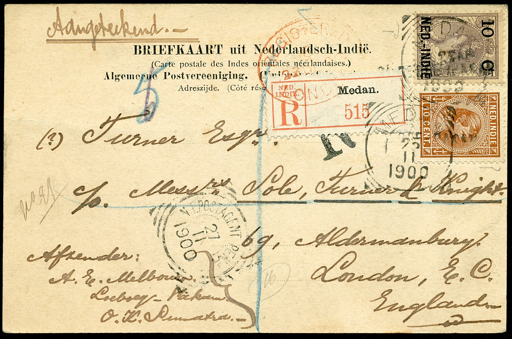 Prentbk. (vz. met geschreven, niet-filatelistische tekst) gefr. met 10c Hangend Haar en 10c Bontkraag afgest. in blauw met naamstempel LOEBOEG-PAKAM over Medan, daar op 25-11-1900 aangetekend en via de N.I.Postagent Penang 27-11 naar Londen 23-12