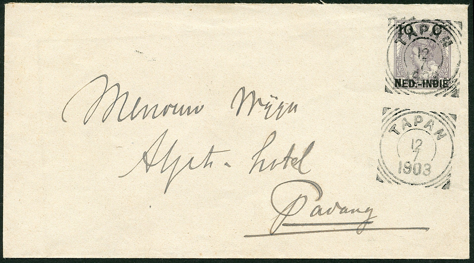 TAPAN op env. G14 met twee luxe afst. van dit veldpostkantoor op 12-7-1903 verz. naar Padang 12-7 (SvL 150)