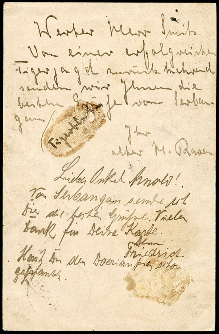 Bk. G21 ondertekend met vingerafdrukken in tijgerbloed, vlak daarvoor geschoten in Serbangan (Deli), verz. van Kisaran 26-?-1912 naar Duitsland
