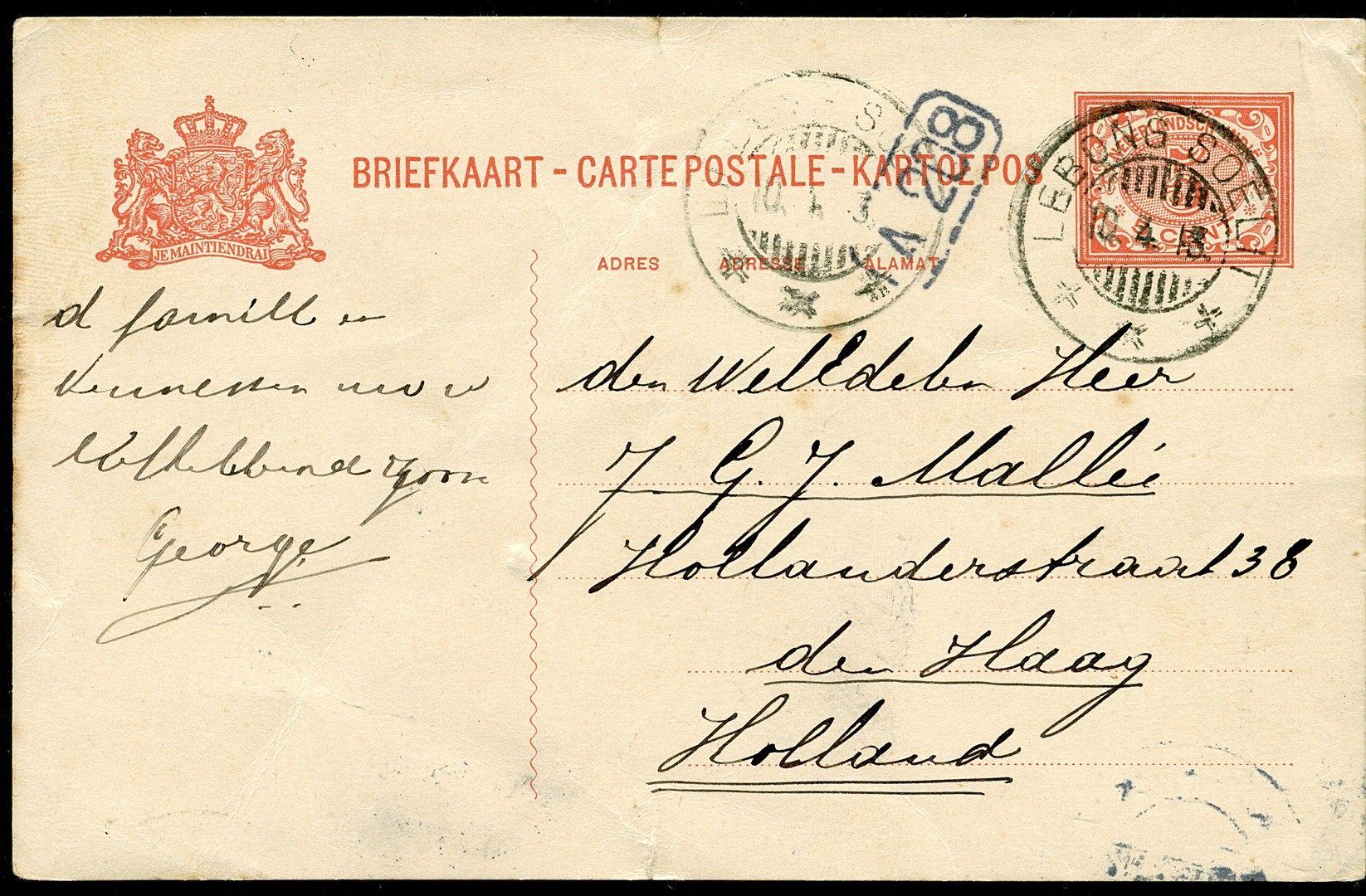 Kortebalkstempels uit Sumatra van Bangoenpoerba (1916), Lebong Soelit (1913) en Pajacombo (1915) op 3 bk. van 5 cent