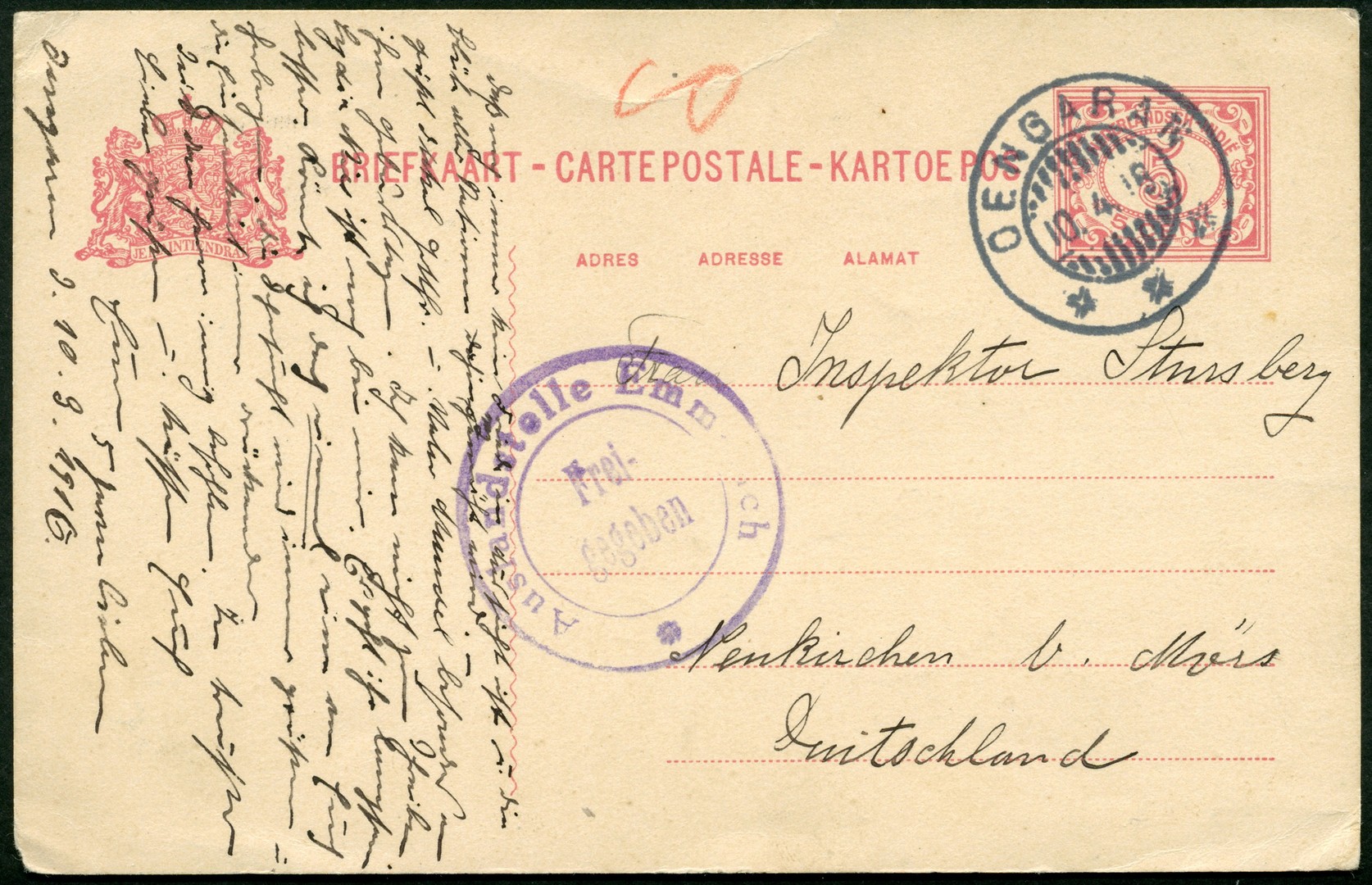 Kortebalkstempels van Java van Lembang (1916, prentbk.), Oengaran (1916, 5c bk) en Porrong (1916, 5c bk)