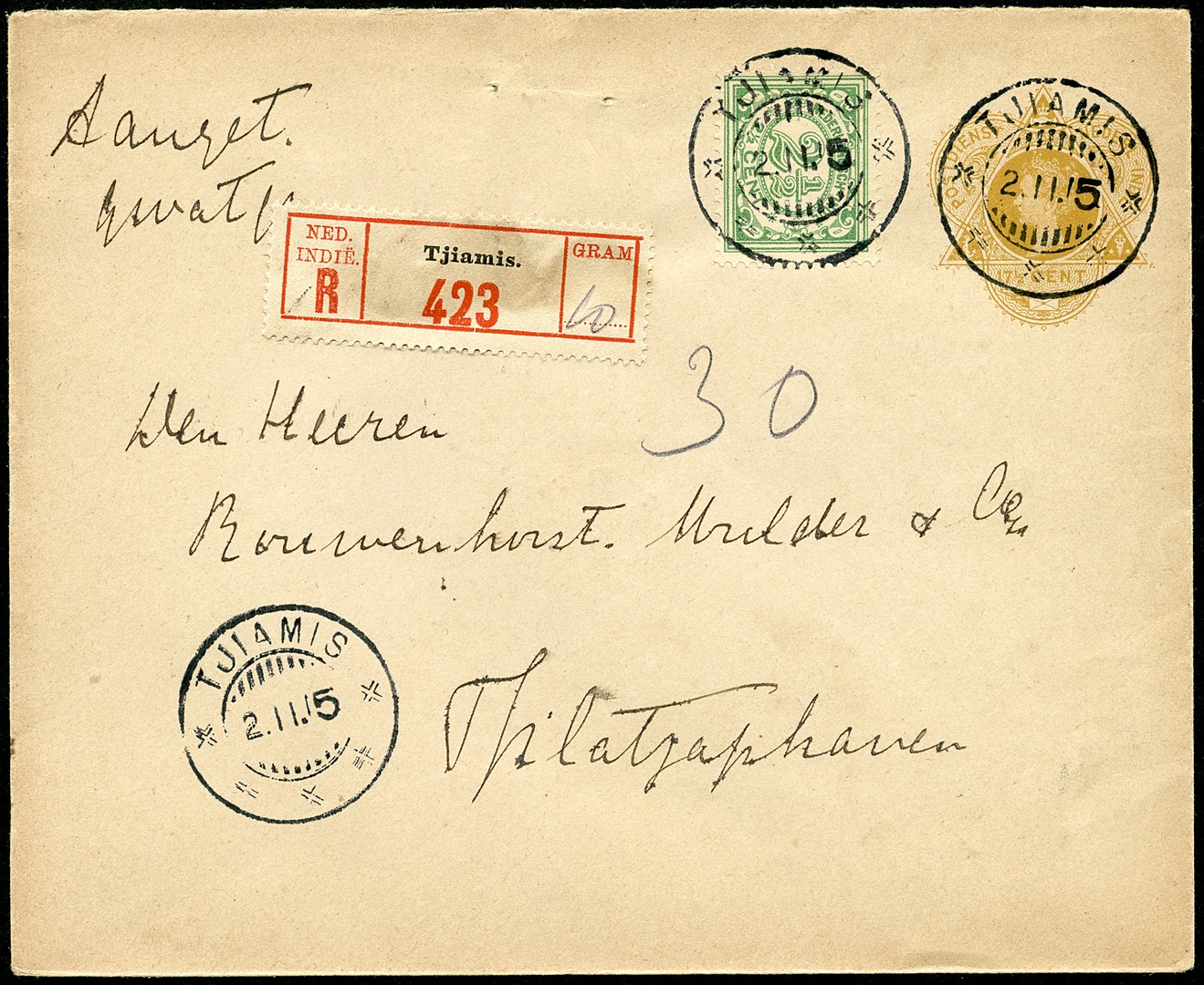 Kortebalkstempels van Loeboesikaping (13-8-1915, naar Stuttgart), Pematangsiantar (9-12-1913, naar New York), Tjiamis (2-11-1915, naar Tjilatjaphaven) en Tjibeber (16-1-1915, naar Leiden) op vier mooie, aangetekende enveloppen