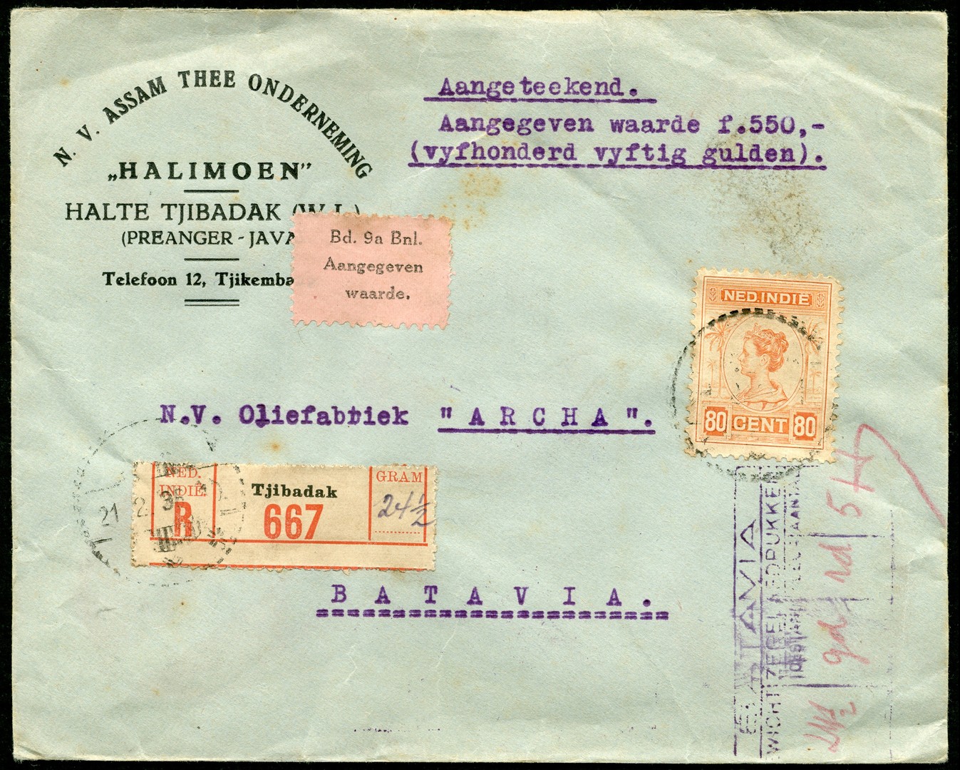 Valeur. Env. van 24½ gram waarop 80c nr. 131 als enkelfrankering (schaars!) met aangegeven waarde van fl. 550 van Tjibadak 21-2-1936 naar Batavia 22-2 met geperforeerd roze strookje