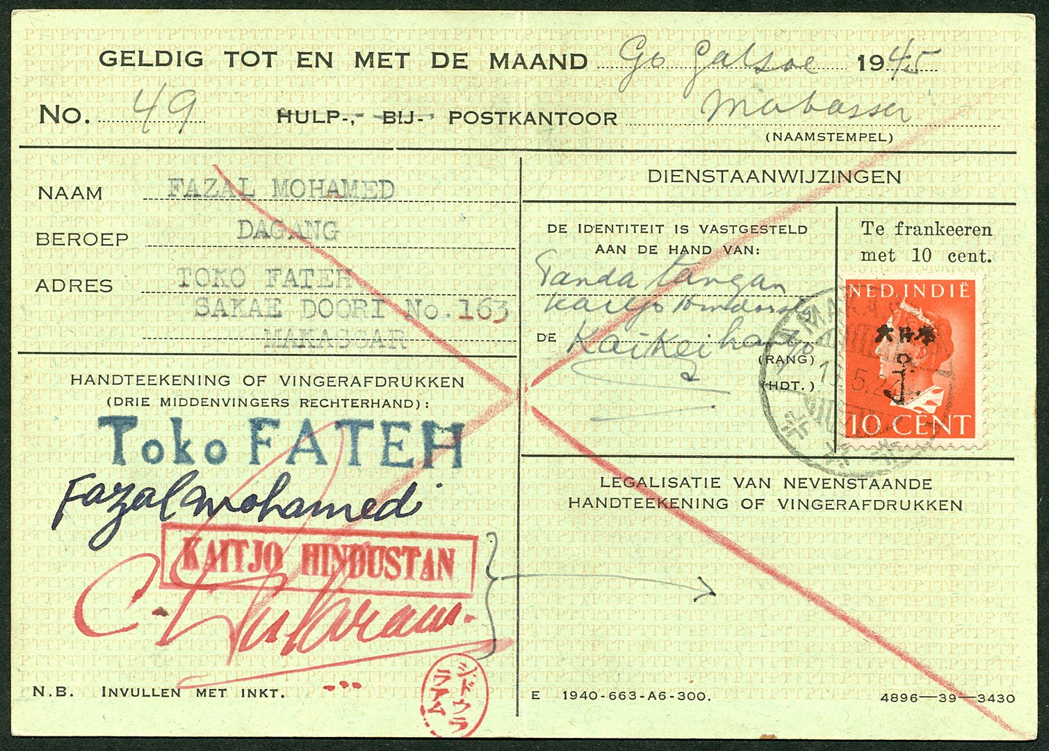 Celebes. 10 Cent van Konijnenburg no. 111z-43II on Identity Card Bu.JF56 (RRR) cancelled Makasser 18.5.24. Extremely rare postal document of which only three used in the Navy area are recorded. This item is illustrated in Bulterman's catalogue on page 111
