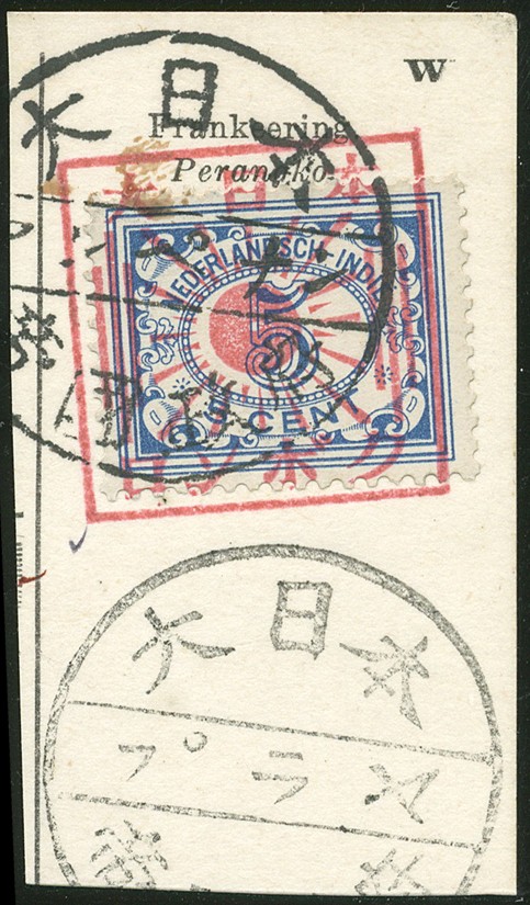 Lesser Soenda Islands. Lombok. 5 Cent Numeral with Lombok Sun overprint in red no. 511r-42 on M.O. fragment, beautifully cancelled PRAJA, with transit/arrival pmk Ampenan. Only a few items from Praja recorded. ? 300