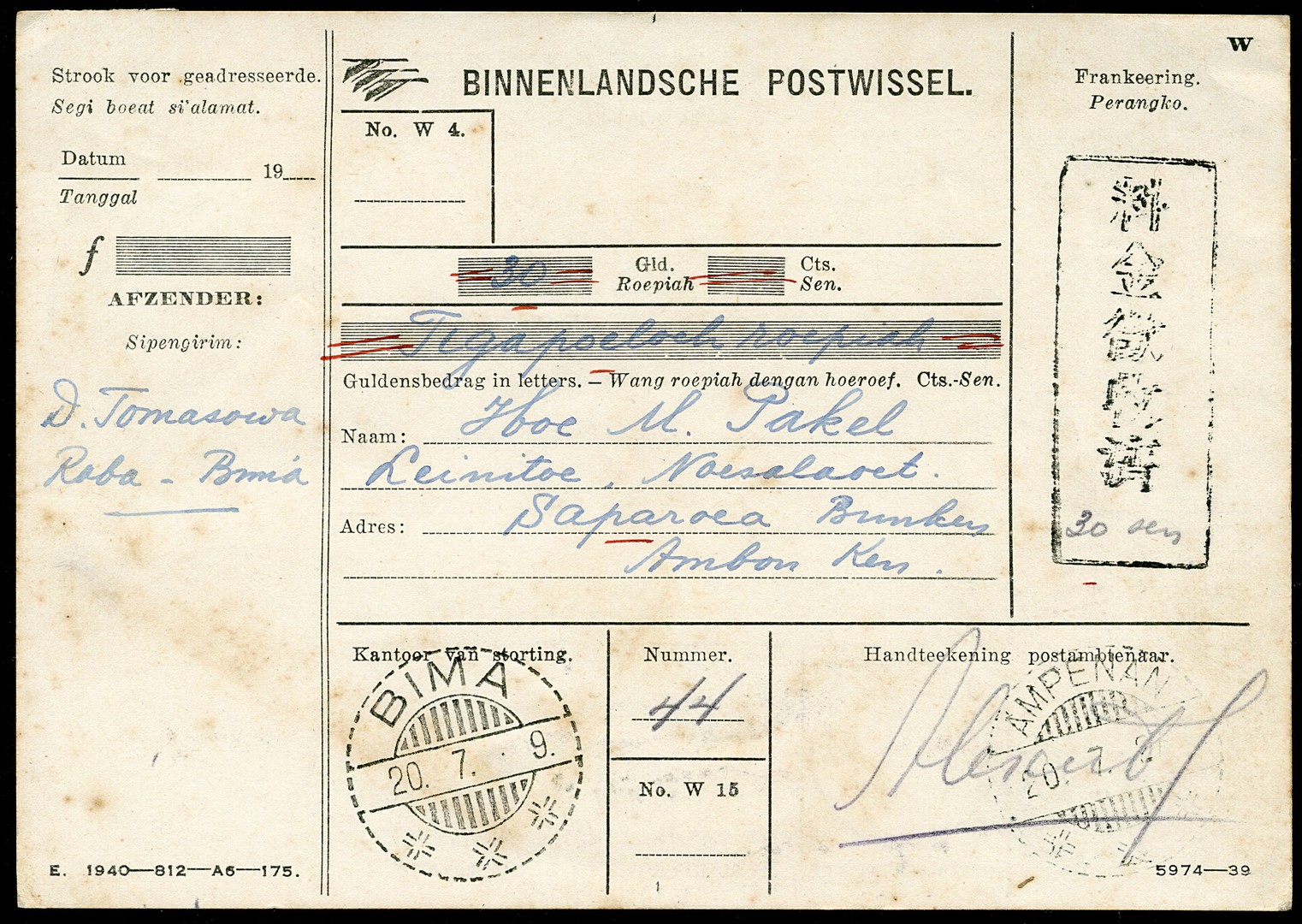 Lesser Soenda Islands. Soembawa. Postage Paid mark in black with written '30 sen' Bu.JB61 type F on complete M.O. Bu.JF41a from the village Raba near Bima 20.7.9. via Ampenan 20.7.27 to Saparoea (no arrival pmk)