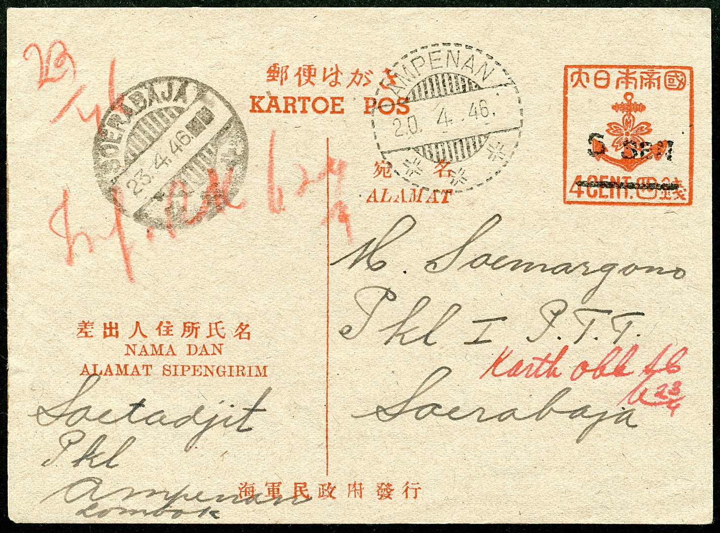 Lesser Soenda Islands. Lombok. 5 SEN on 4c re-valued Navy postcard Bu.274 (? 900) from Ampenan 2.0.4.46 to Soerabaja 23.4.46. Addressee could not be located and information could not be found in the register of the soerabaja post office ('karth obk Sb 23/4' = karthotheek onbekend Soerabaja 23 april). On the reverse a triangle cachet with pencil notes 'Onbek 25-4-'46' (Onbek = onbekend = unknown). The 5 SEN is type I and the base card is the rarely used thin paper variety. Only three used copies recorded. Illustrated on the back of the book 'The Postal History of the Lesser Sunda Islands, Moluccas, and New Guinea during the Japanese Occupation and Immediate Aftermath 1942-1946' by J.R. van Nieuwkerk. Exhibition item
