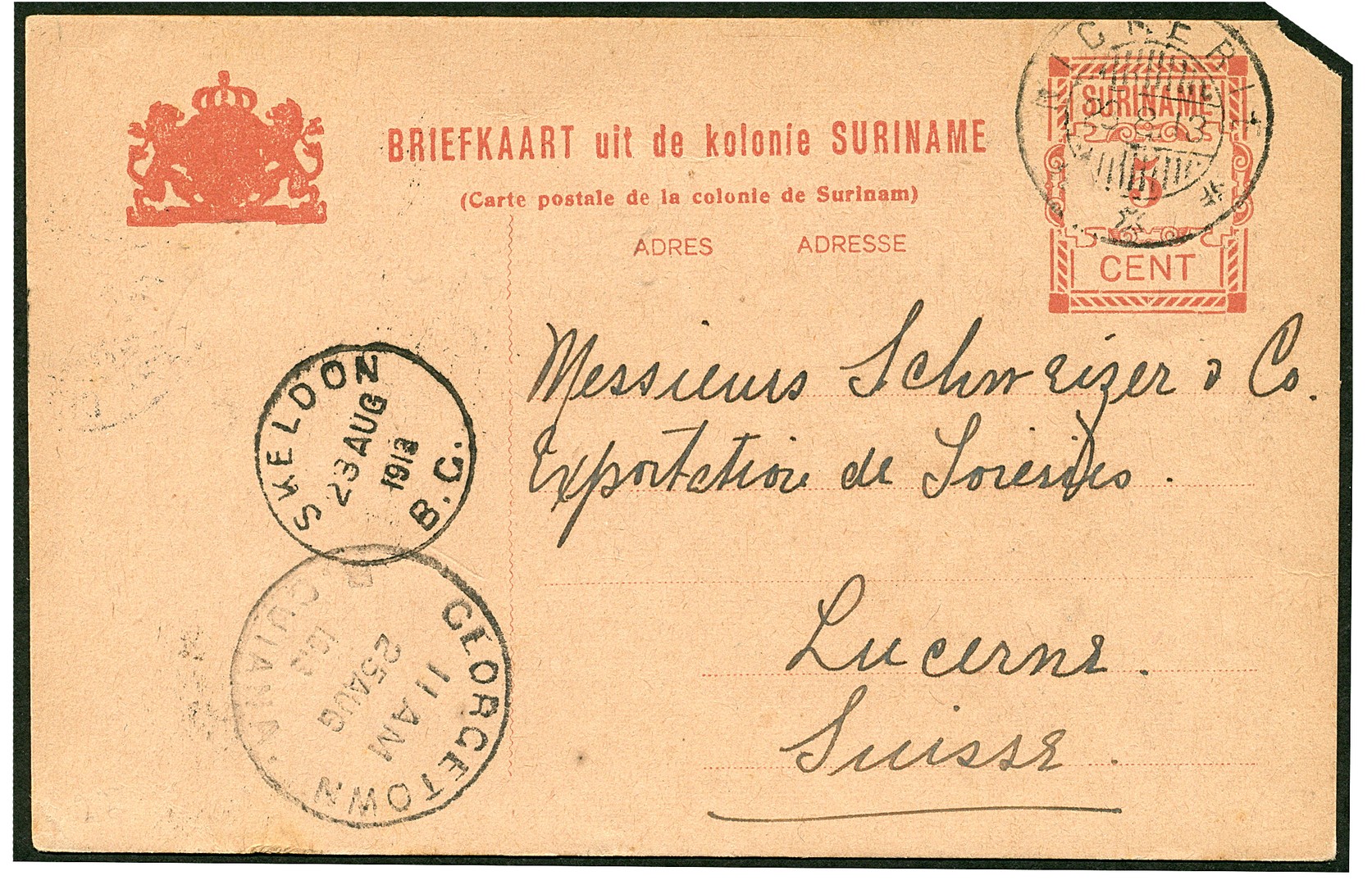 Bk. G20 van Nickerie 23-8-1913 (kortebalk) over Skeldon 23-8, New Amsterdam 23-8 (az.) en Georgetown 25-8 (3 kantoren in Brits-Guiana) naar Luzern