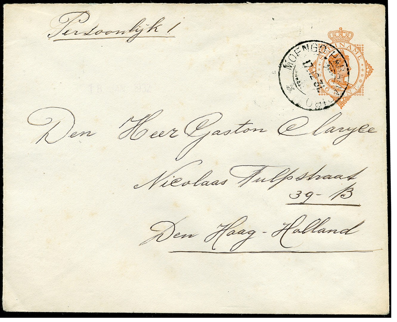 Env. G17 afgest. met kortebalk Moengo-Paramaribo 17-12-1931 via Paramaribo 17-12 naar Den Haag