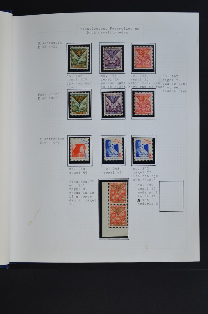 PLAATFOUTEN, uitgebreide, gedocumenteerd opgezette collectie 0/*/** volgens Van Wilgenburg en Mast van 1899-ca. 1990, waaronder vele goede en hoger genoteerde nummers als 98P, 146P*, 171P*, 171Af*, 288P**, 292P**, 403BP**, 499P, 533P, 1070P**, 1444P op kaart uit De Bilt, ook diverse op FDC´s als 653P, 609P en 1179P, keurig maar niet op volgorde op bladen in Victoria- en Pelikaan-album