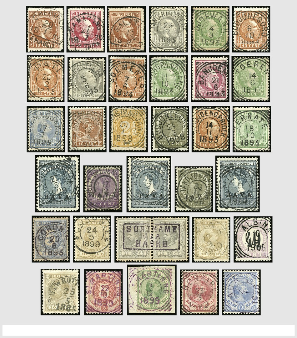 POSTHISTORIE O.G.D., klassieke stempels op losse zegels van Ned.- Indië (o.a. halfrond-franco-, vierkant-, naam- en puntstempels), Curaçao en Suriname (o.a. rond-, kleinrond- en routestempels) in insteekboek