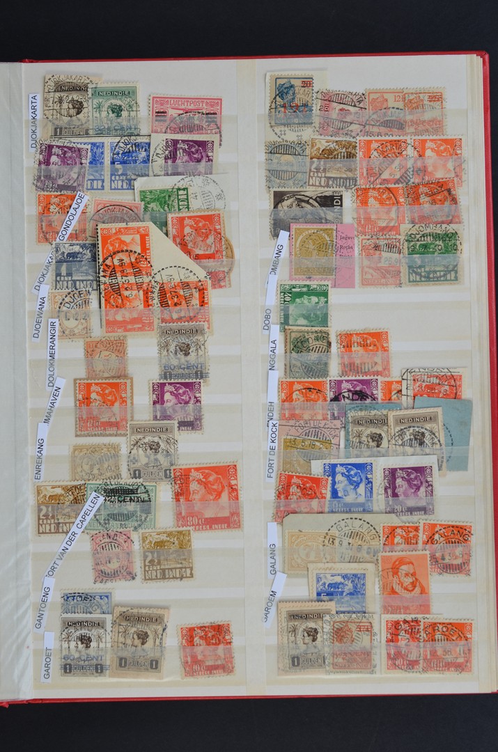 NED.- INDIË POSTHISTORIE, verzameling langebalk- en wat puntvlakvullingstempels (LB, PV) op losse zegels w.o. op knipsel van ruim 500 kantoren waarbij schaarse, met veel mooie afst. alfabetisch opgezet in 2 insteekboeken