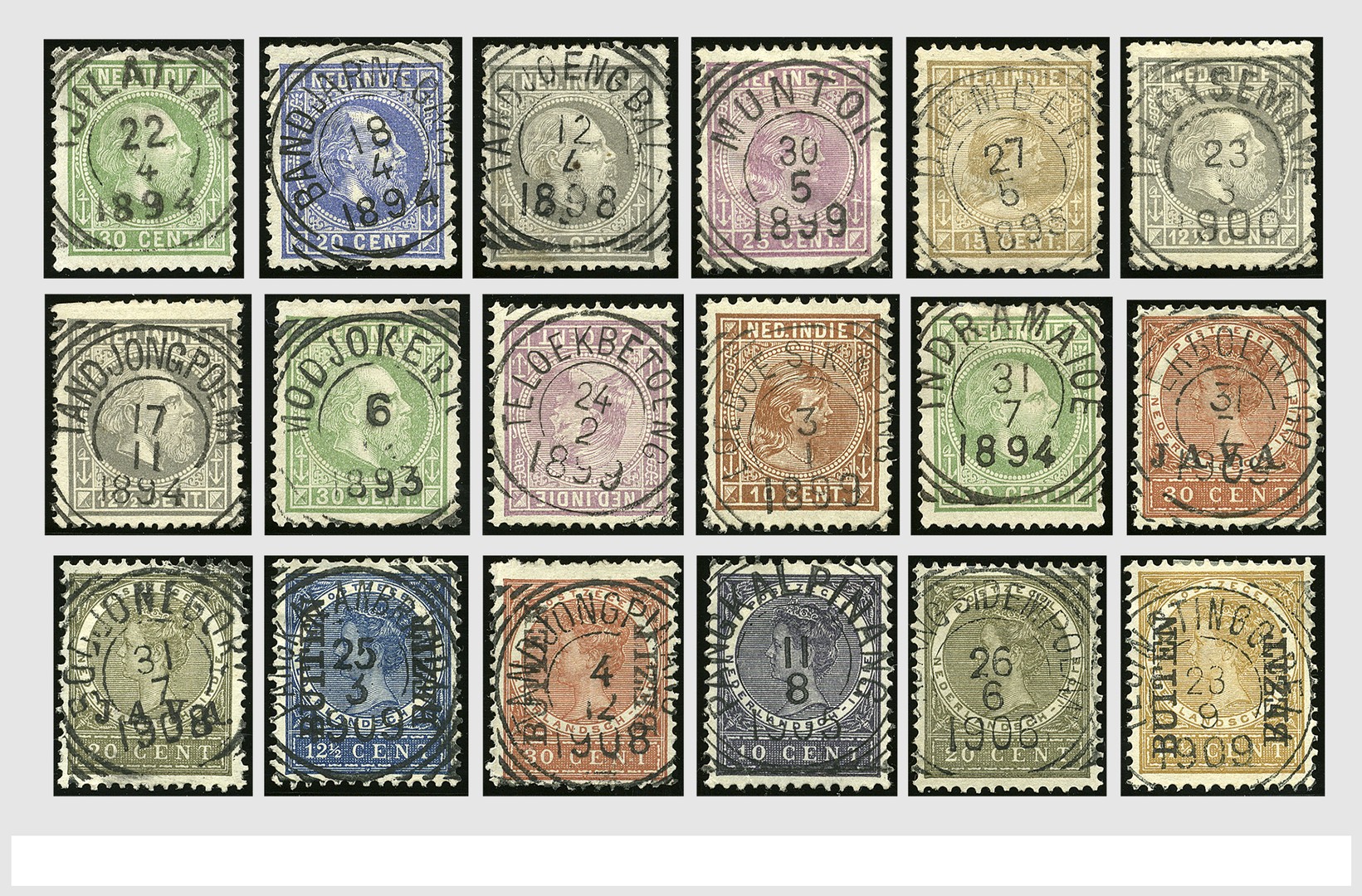 NED.- INDIË POSTHISTORIE, vierkantstempels op losse zegels waaronder mooie afstempelingen in insteekboek, alsmede doubletten en Hangend Haar engros op insteekkaarten