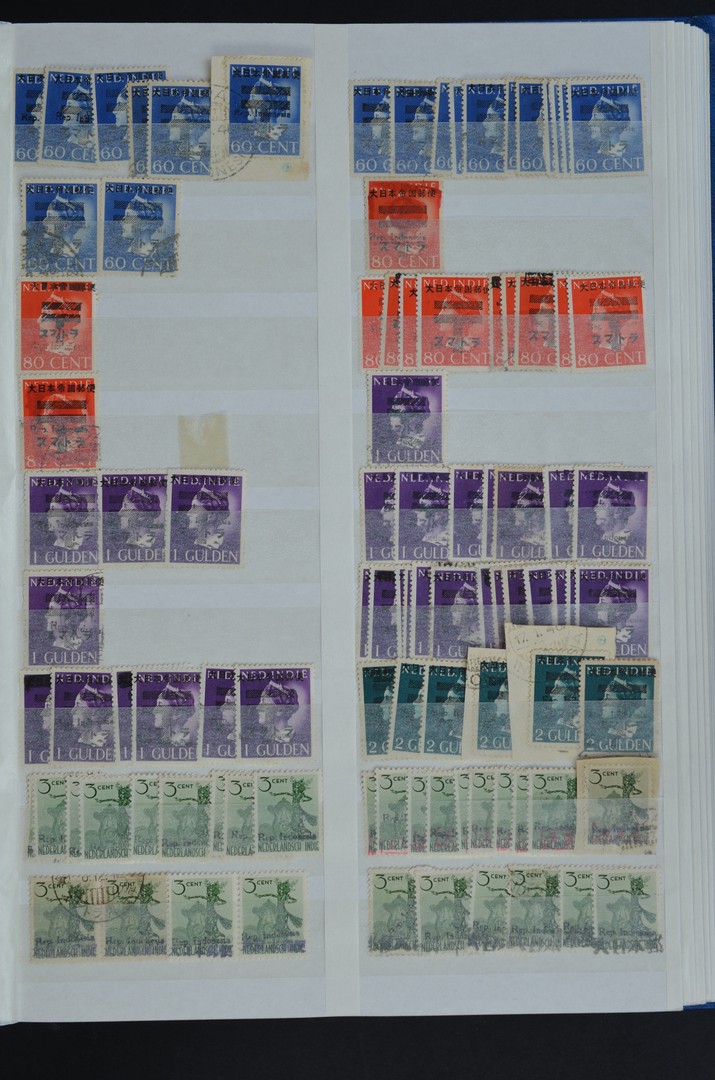 REPUBLIK INDONESIA 1945-1949, JAVA & SUMATRA. Stock book filled with thousands of unused and used stamps (some nice pmks) showing a very great variety of hand stamp and machine overprints, stamps with pencil lines and brush strokes, Provisional issues, General issues with and without overprints, many of these in larger quantities, all together a most interesting stock and treasure trove, rarely offered in this quantity and variety