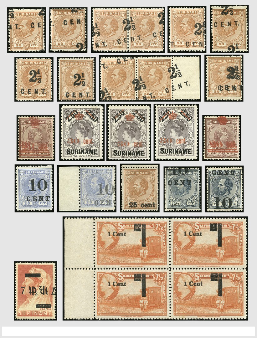 SURINAME OPDRUKKEN 1892-1950 0/(*)/*/**, zeer gespecialiseerde collectie opdrukken op frankeer- en luchtpostzegels 1931 met allerlei opdrukfouten, variëteiten, kopstaande opdrukken, dubbele opdrukken, spiegelopdrukken, verschoven, dik, dun, met breuk, schuin, zonder punt (bv. Do X), zegels in paren, blokken, met velrand, hoekstukken, etc. inclusief 11 poststukken, uitstekend gedocumenteerd beschreven, in Safe ringband. Prachtobject en in deze vorm zelden aangeboden