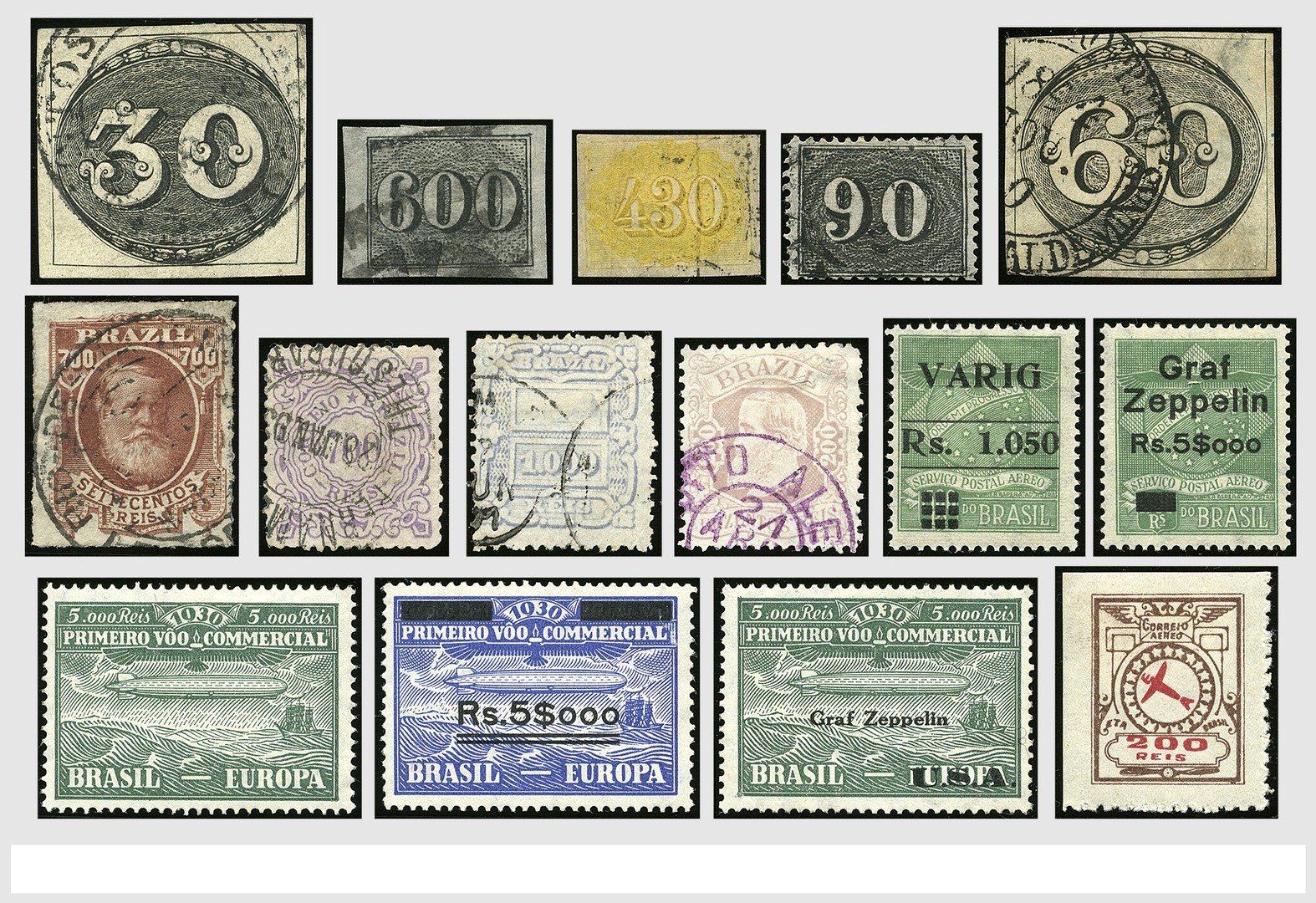 BRAZILIË 1843-1976, o/* meest gebruikte collectie met luchtpost, port en dienst in Yvert album. (ronde rug), met vele goede nrs., series en blokken(o.a. 1/9) en 59 poststukken waarbij ca. 28 Luchtpost-, waarbij Zeppelin-vluchten. Mooie koop met hoge waarde!
