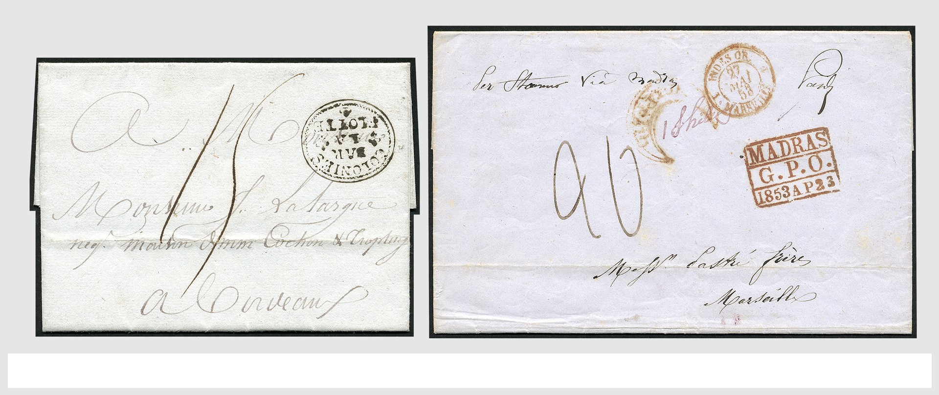 FRANKRIJK POSTHISTORIE, 54 voorfilatelistische brieven betreffende briefvervoer tussen Frankrijk/Koninkrijk Sardinië en Italië, met Rusland, scheepspost uit overzeese landen w.o. brieven uit Haiti (1791 en 1792), Batavia (1854), Makassar (1868), India, Brazilië, La Guaira (Venezuela), Guadeloupe (inhoud betreft slavenopstand, 1849), etc. met een grote verscheidenheid aan stempels, postale aanduidingen, goed gedocumenteerd beschreven op bladen in een ringband. Ex Kroesen