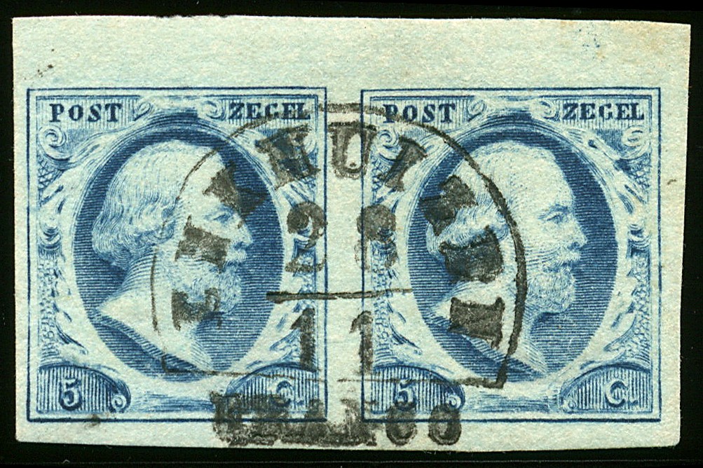 ENKHUIZEN A (EY.250) op 5 cent nr. 1b-Pl.I-52/53. Luxe randpaar met superbe afst. Ex Dreikurs