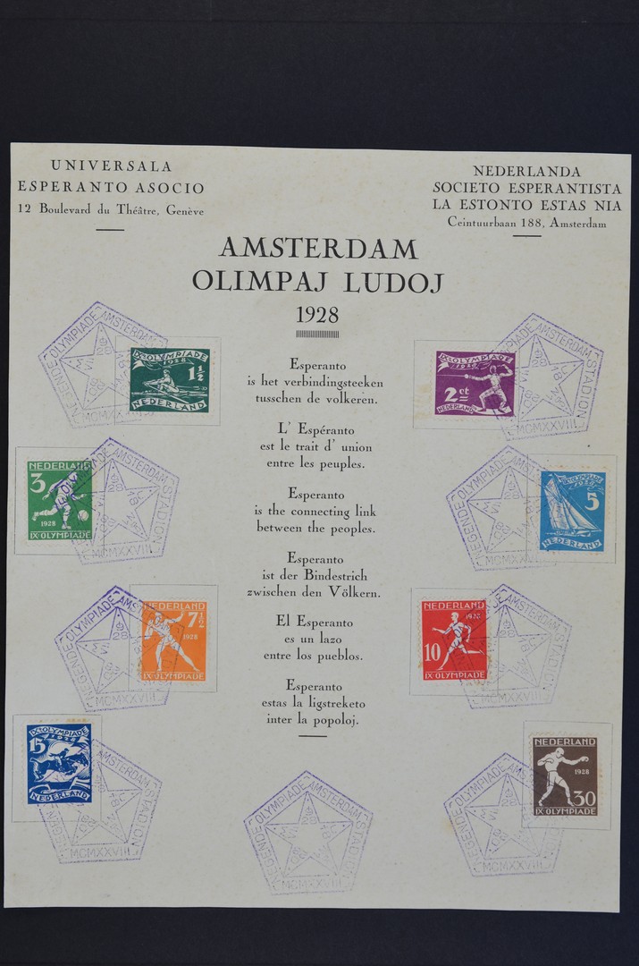 212/19, Olympiade 1928, serie (enkele bruine tandjes) op iets ingekort Esperanto-vel en in violet i.p.v. zwart afgestempeld met speciaal stempel N1 28.VII.28 (openingsdag)